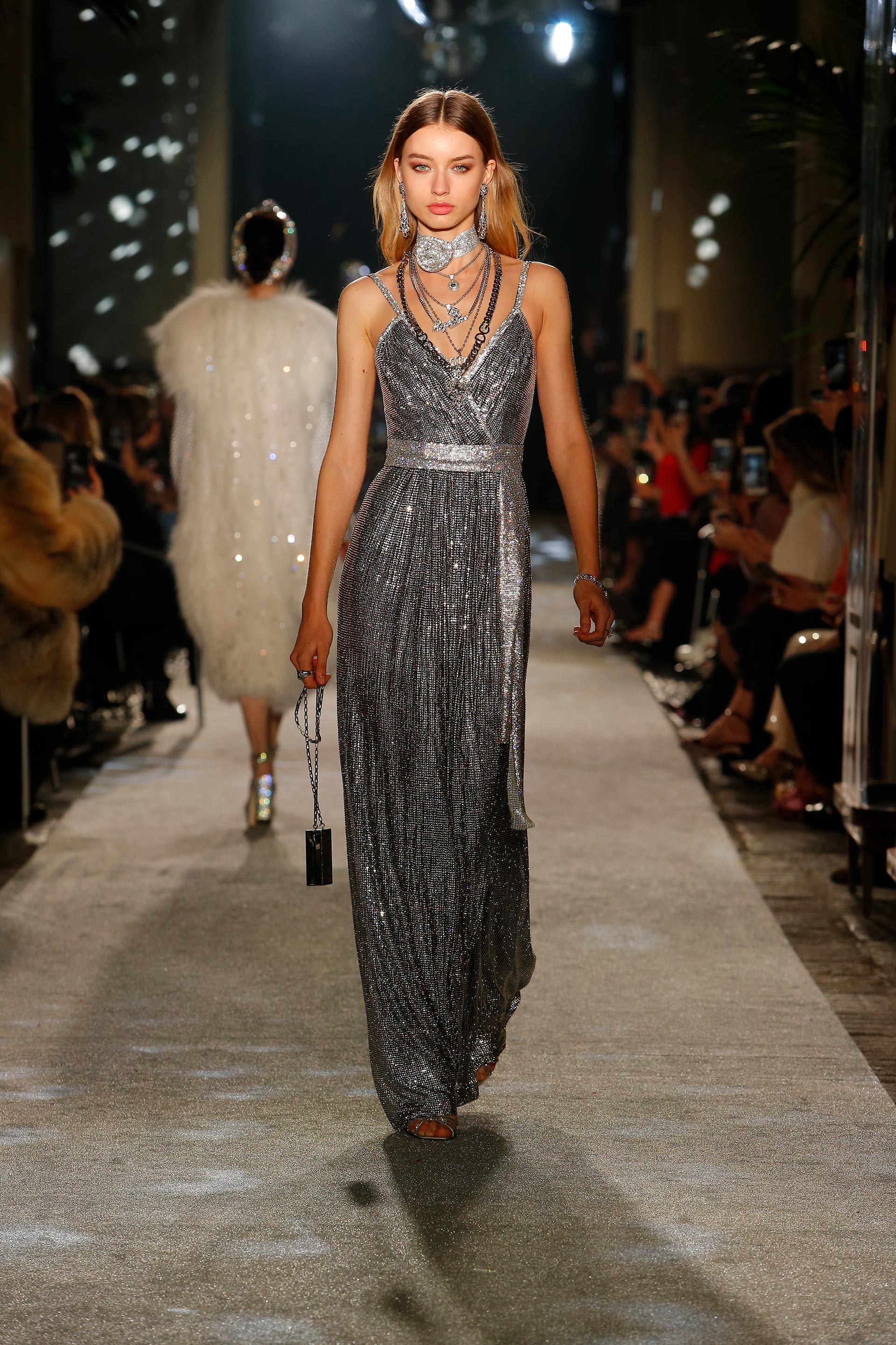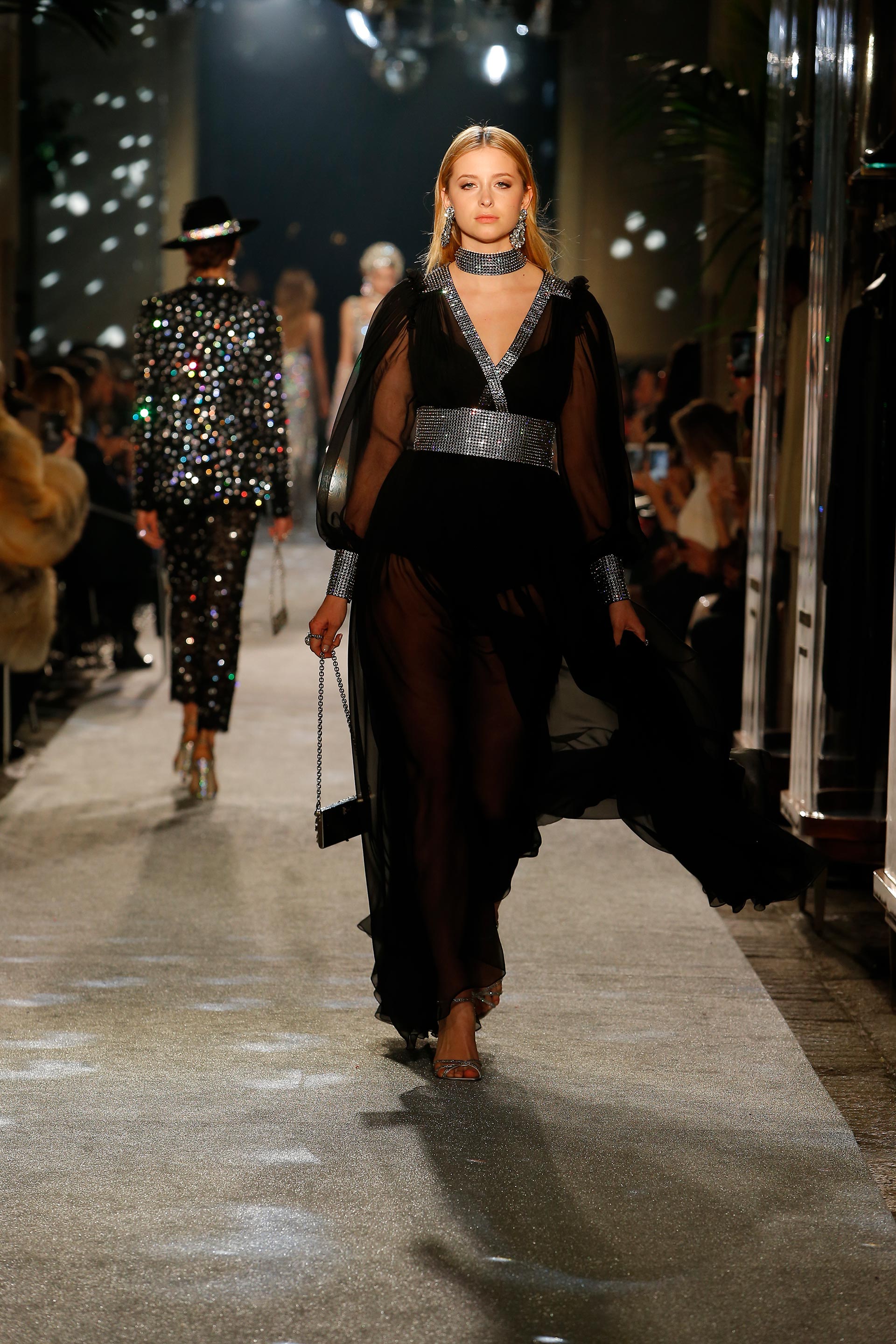Details: Rhinestones, sequins, embellishment, suits, sheer, bustiers, denim, animal print, tulle and metallic fringe.