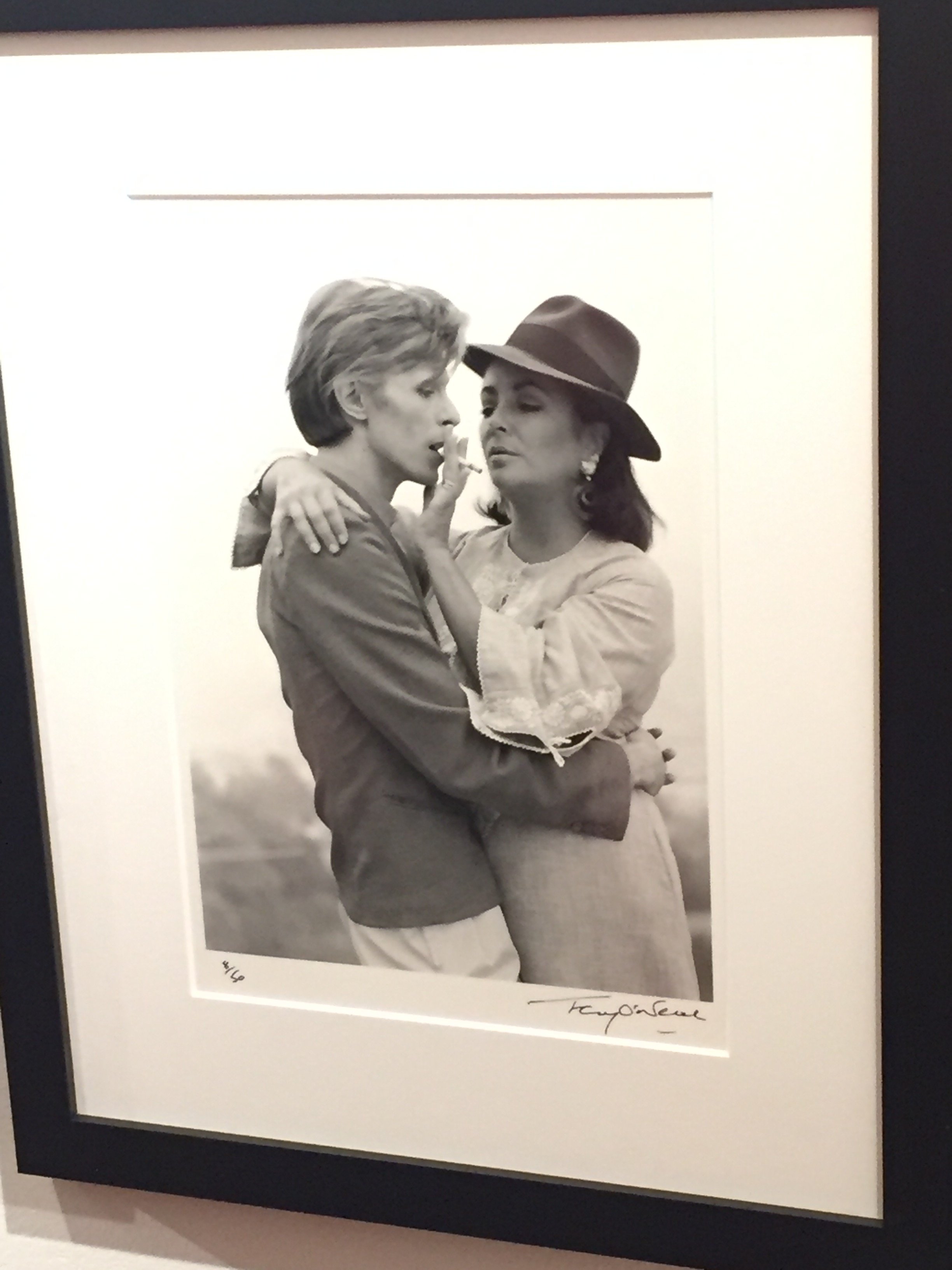 Bowie was not only a musical legend, but also a fashion and beauty icon. The exhibit has a variety of photographs taken throughout his celebrated career by acclaimed photographers such as Duffy, Lynn Goldsmith, Bob Gruen, and Mick Rock. While several of the images were taken during performances, or as part of photo shoots we were most interested in the pictures that had a more intimate quality.  While Bowie’s eccentric costumes, adventurous make-up, and various personas are on display so are candid backstage shots and even more quiet pictures where the rock superstar seems to look right through you.  While the DJ played several of David Bowie’s hits,  Kathryn took her time to get an up close look at these stunning black and white, and color photographs. Being major Elizabeth Taylor fans, we were especially charmed by a photograph of the two sharing an intimate moment during their first meeting in Beverly Hills in 1975. The now iconic picture was taken by British photographer, Terry O’Neill.
