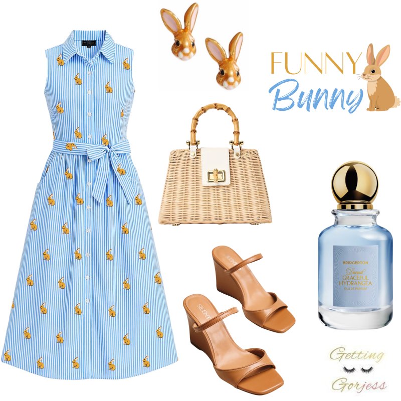 4 Apr 2026 Outfit Inspiration Easter Edition: Funny Bunny Kiel James Patrick Women’s Bunny Meadow Embroidered Shirtdress Silent D Anisa Strappy Wedge Mule Sandal Lilly Pulitzer Leena Top Handle Bag Bridgerton Dearest Graceful Hydrangea Eau de Parfum Kate Spade Desert Muse Bunny Rabbit Earrings