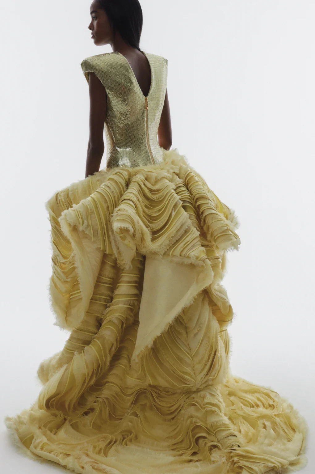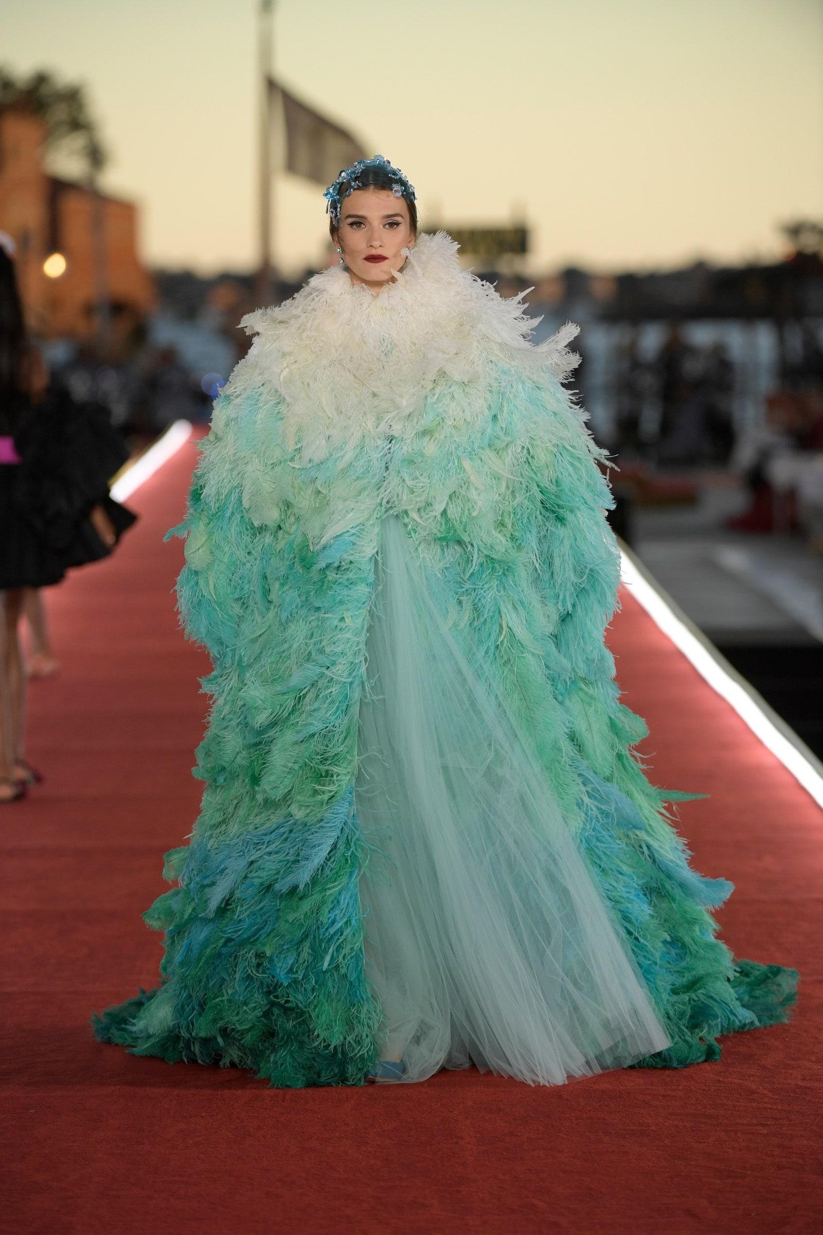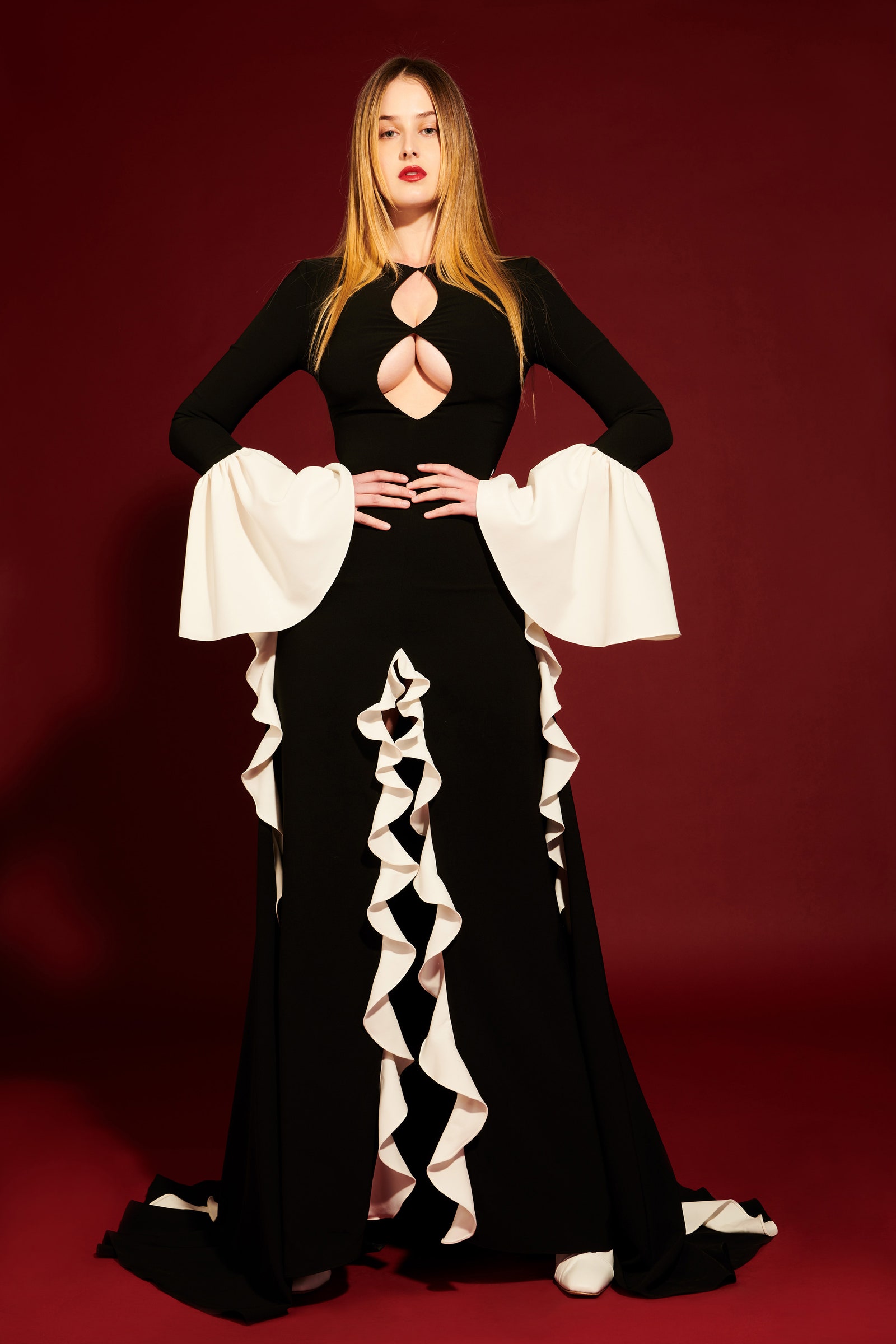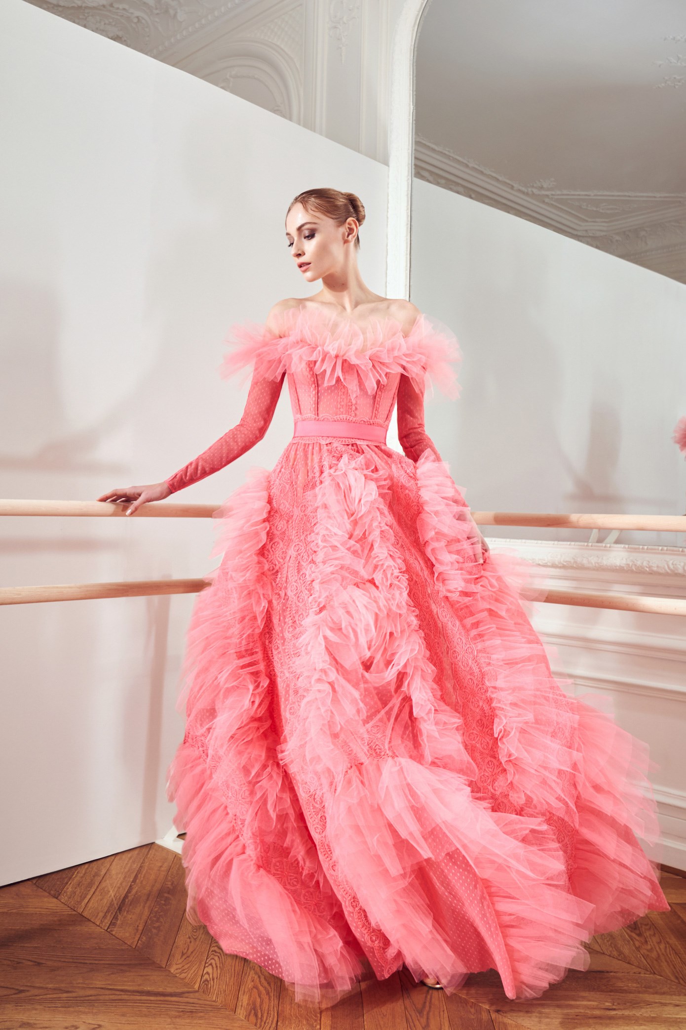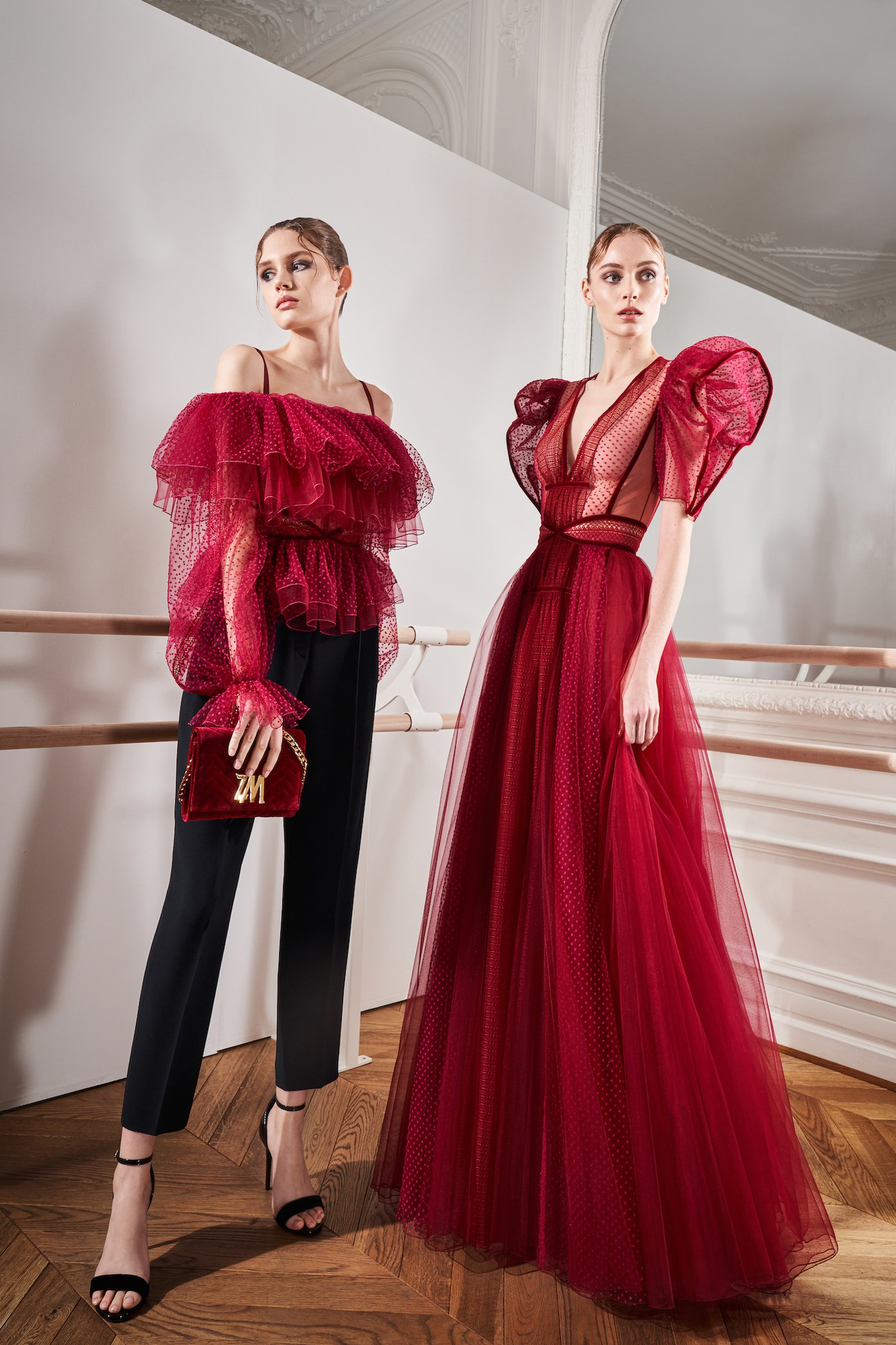 Details: Peplum Ruffles. Squiggly Vertical Layers. Silk Suits. Cutouts. Puff Sleeves, Ball Gowns. Wavy Tulle. Floral Applique. Eye Motifs.