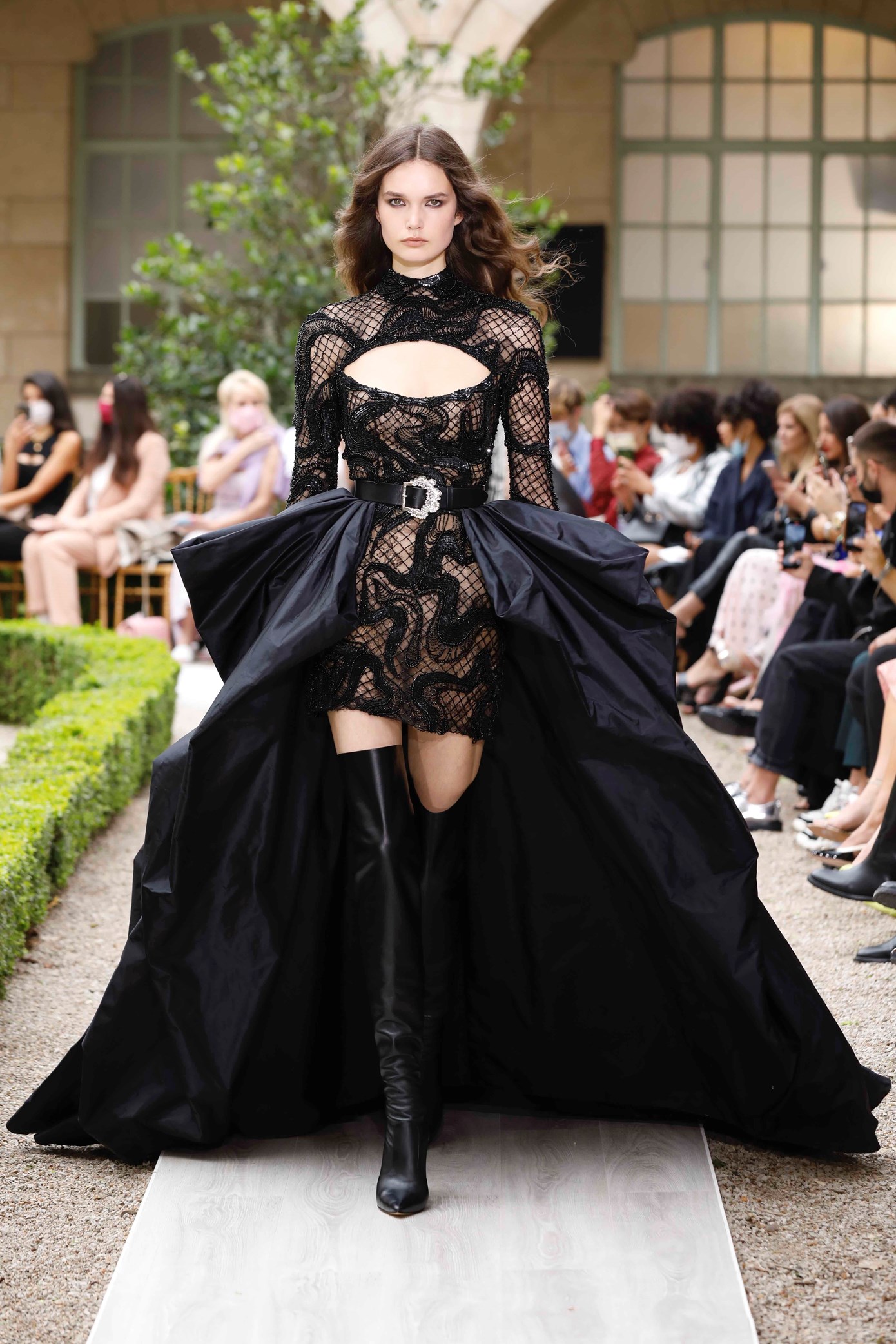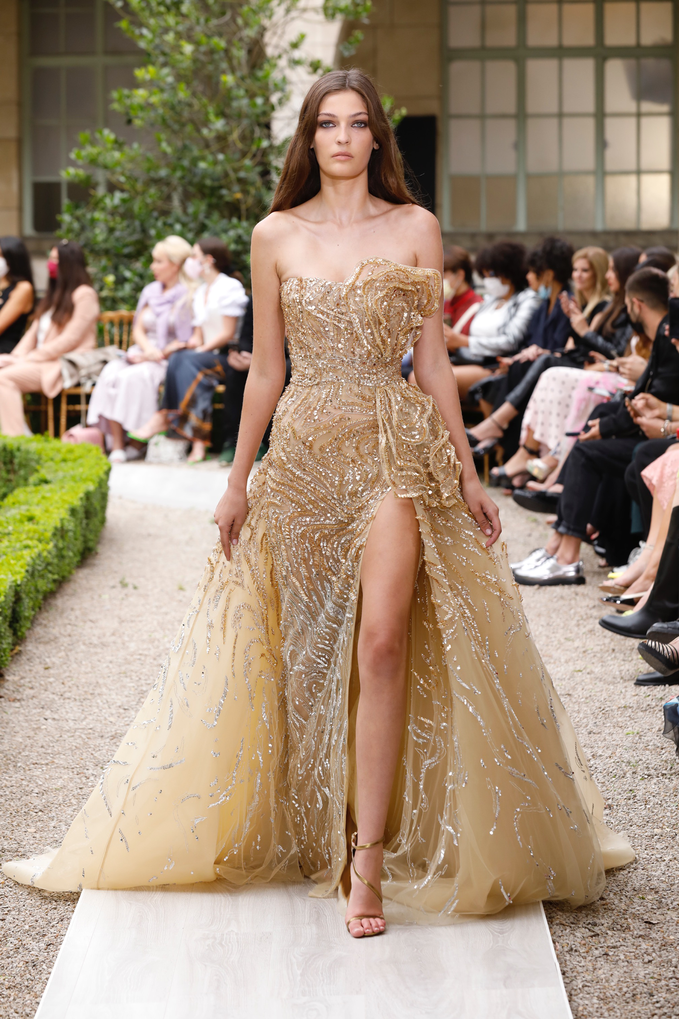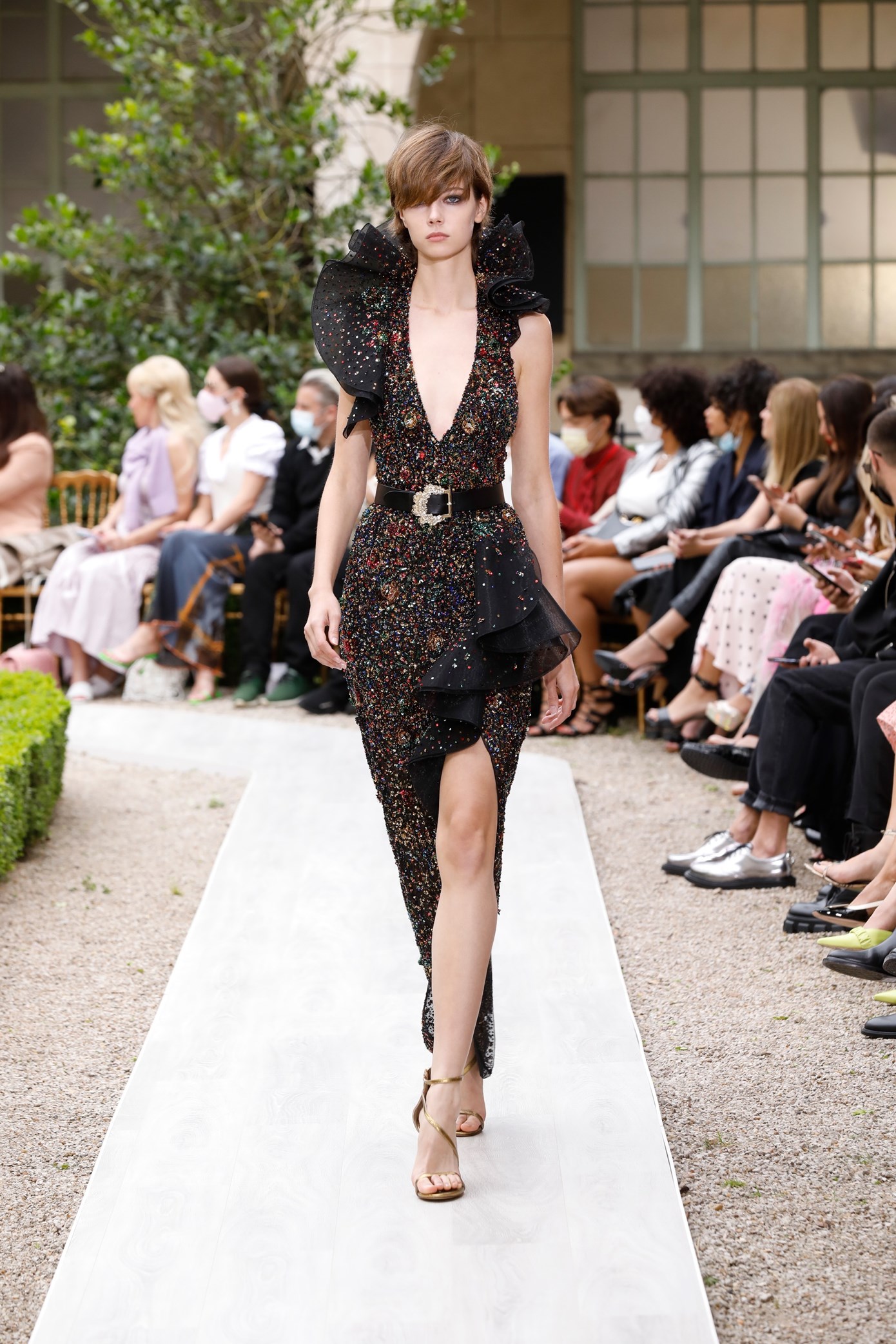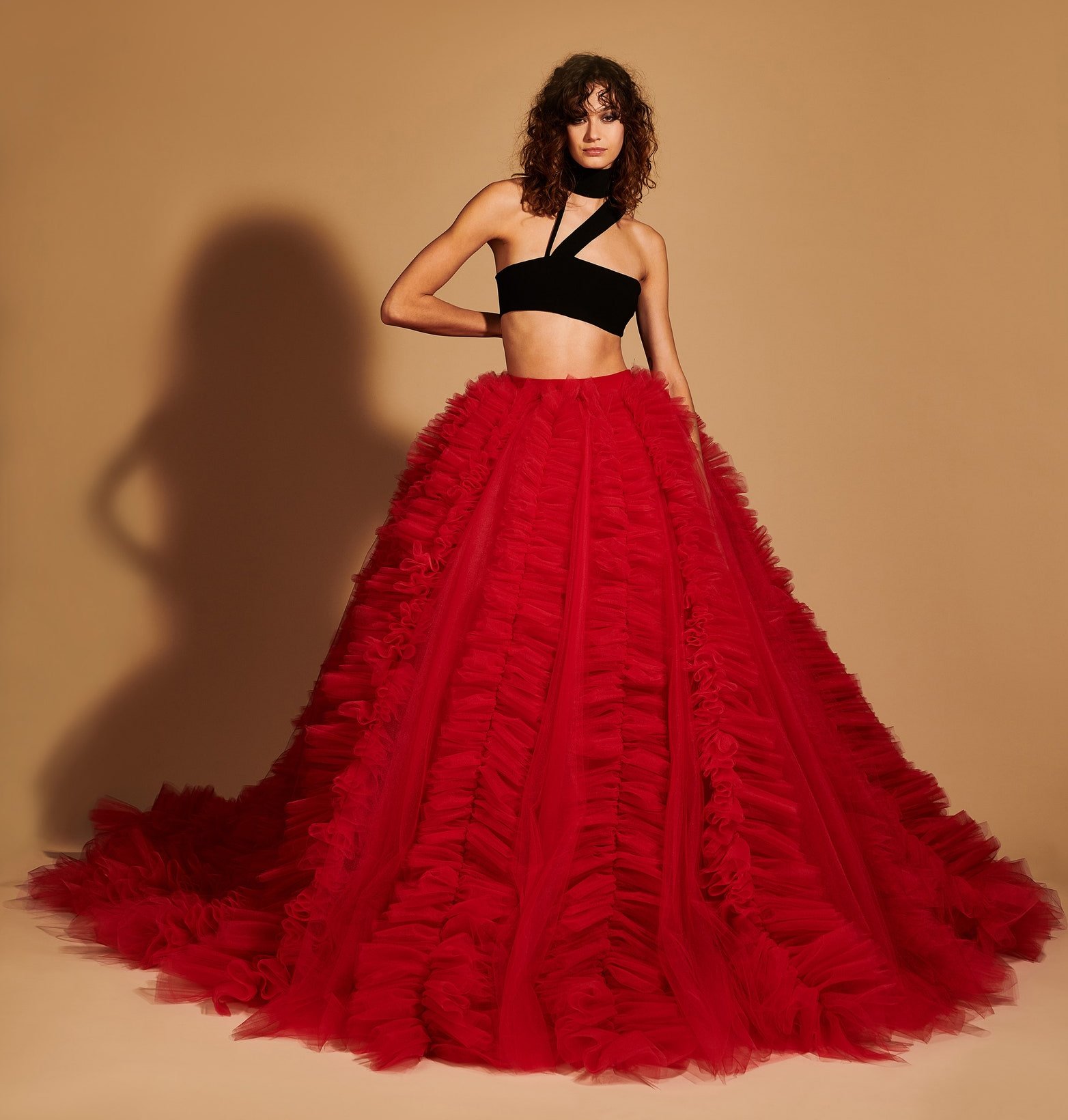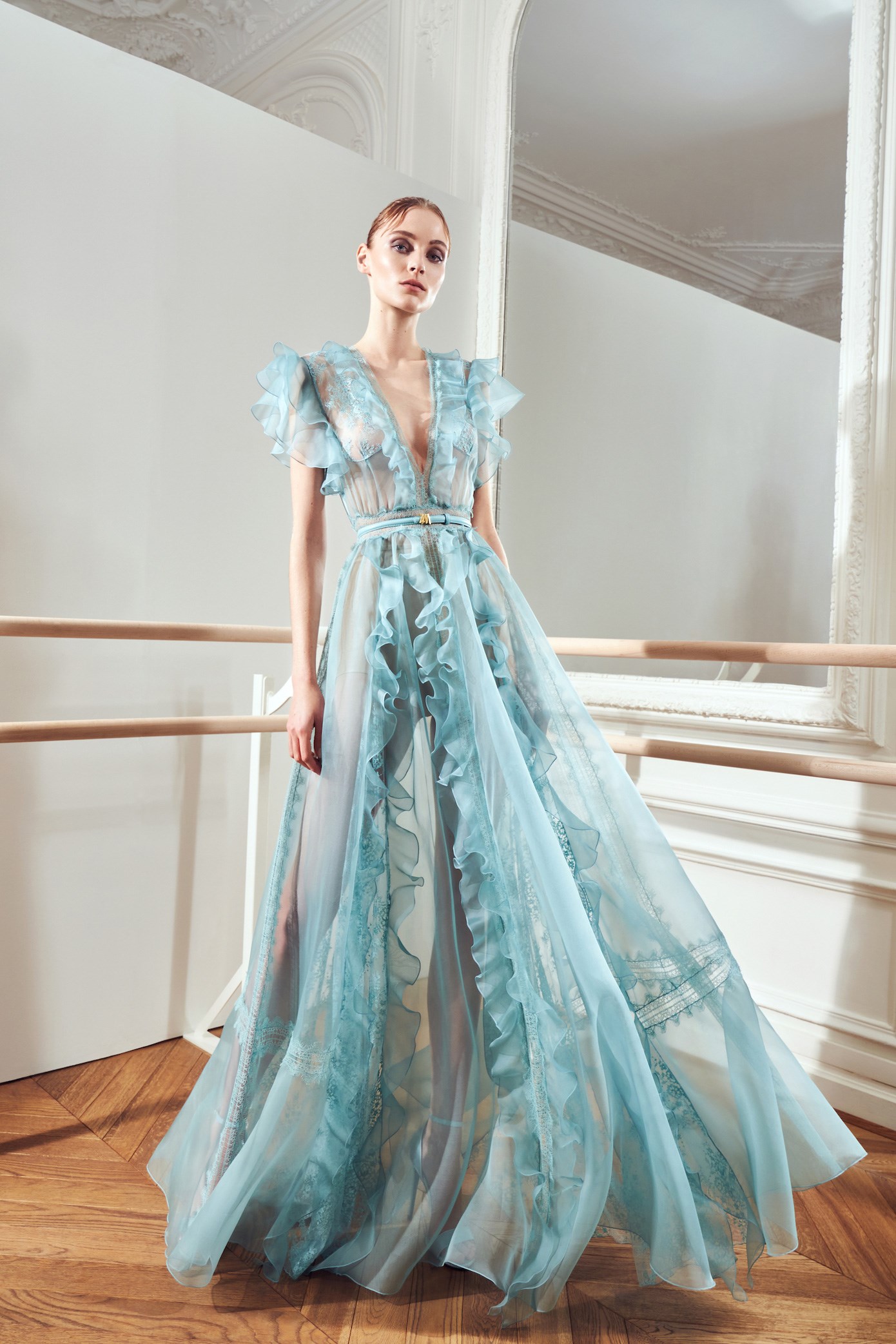 Details: Peplum Ruffles. Squiggly Vertical Layers. Silk Suits. Cutouts. Puff Sleeves, Ball Gowns. Wavy Tulle. Floral Applique. Eye Motifs.