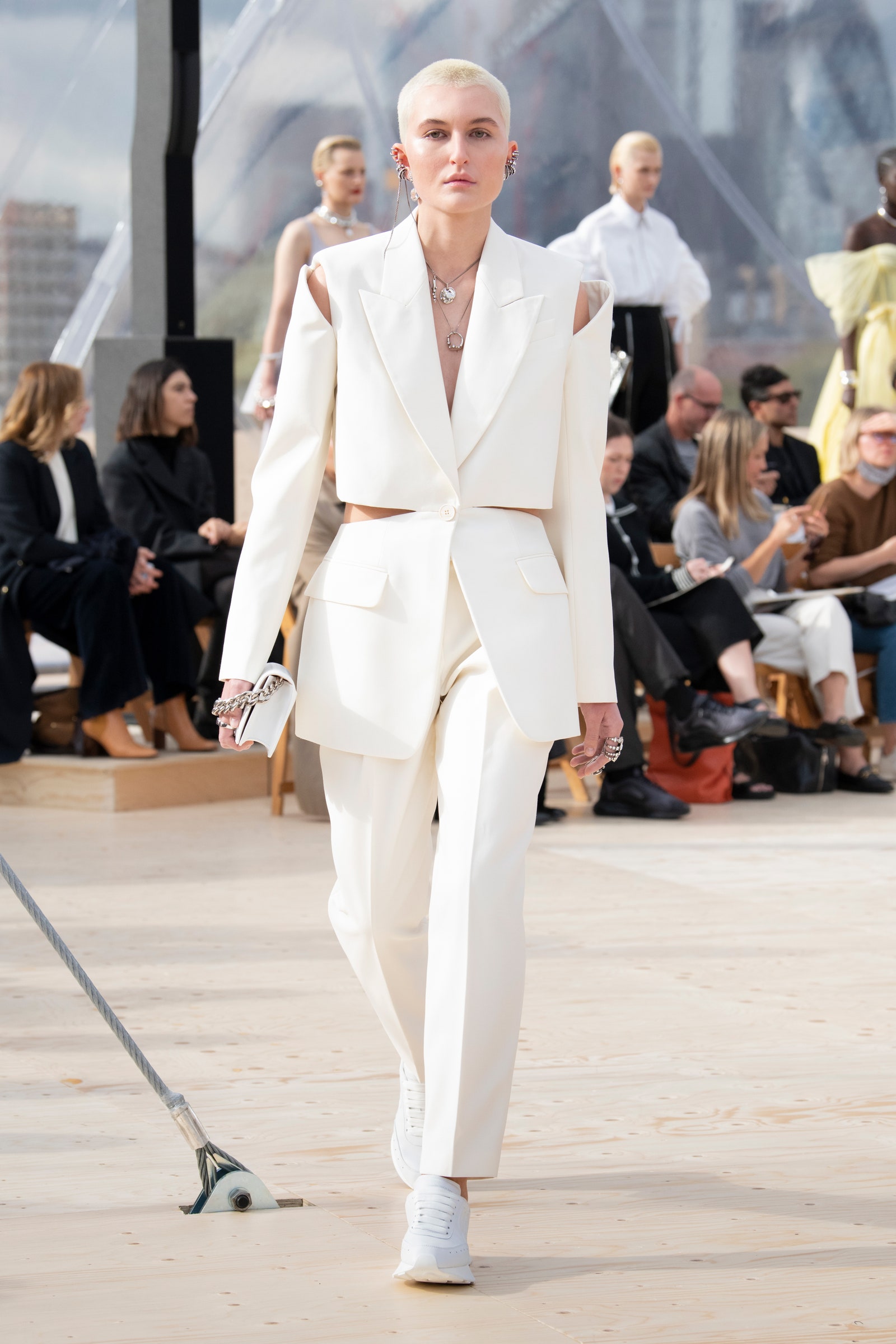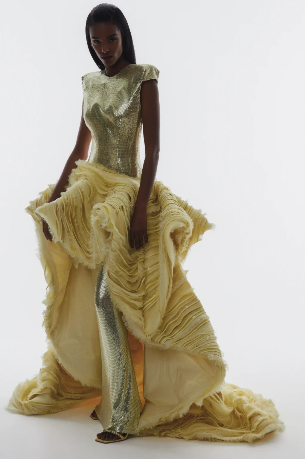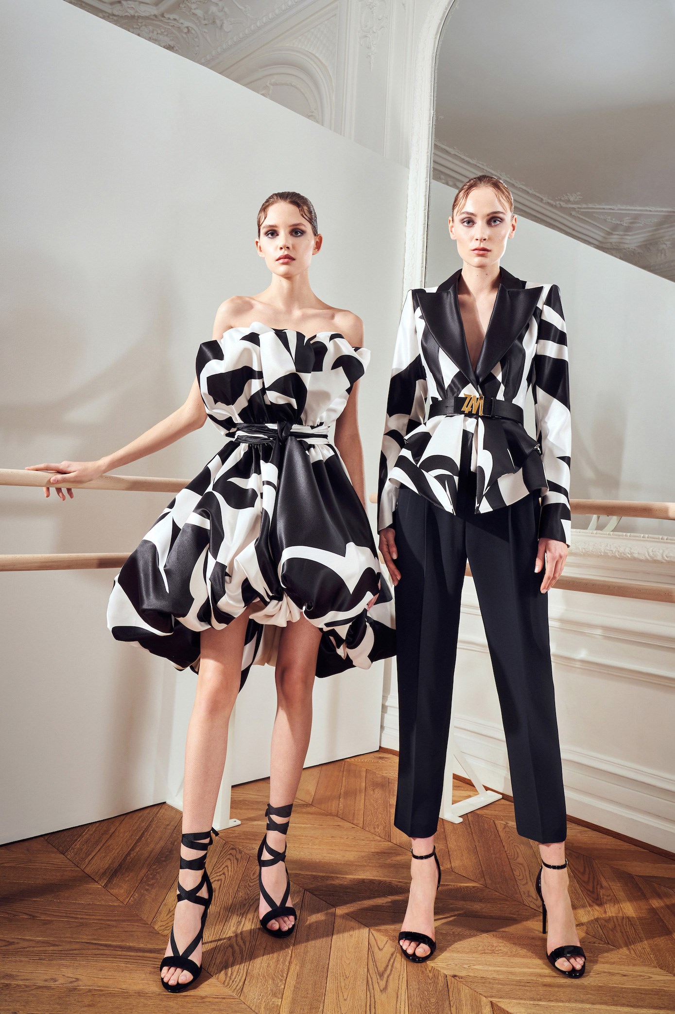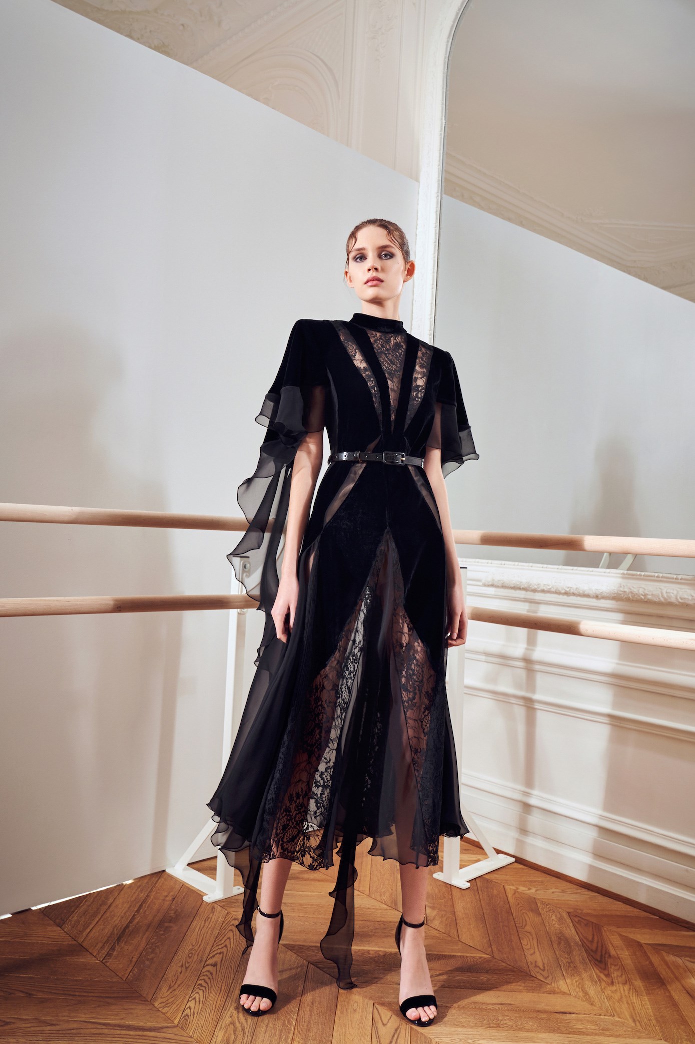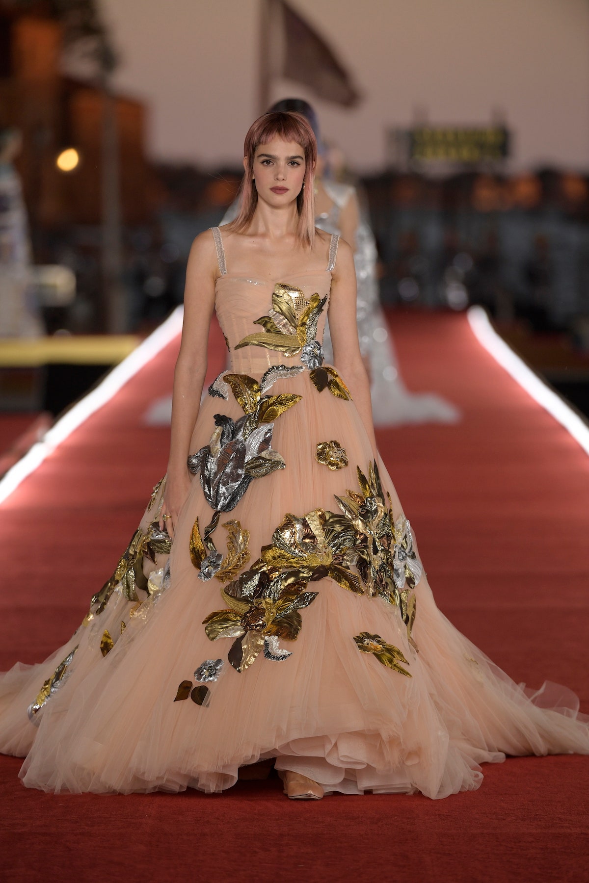 Details: Peplum Ruffles. Squiggly Vertical Layers. Silk Suits. Cutouts. Puff Sleeves, Ball Gowns. Wavy Tulle. Floral Applique. Eye Motifs.