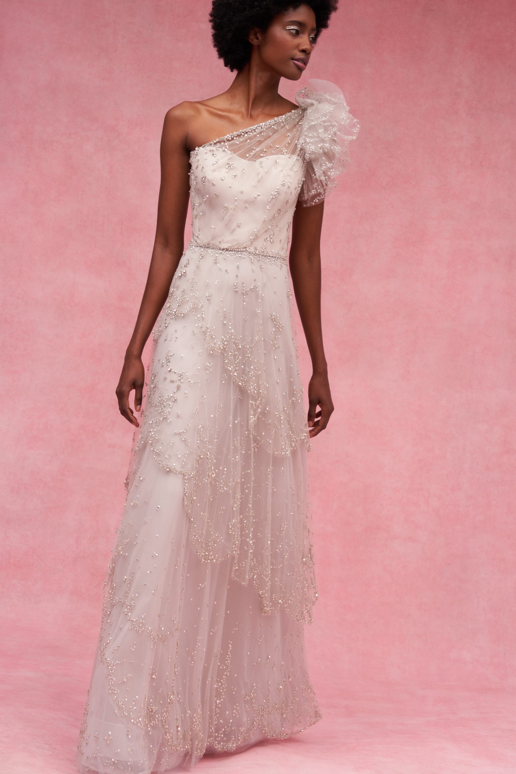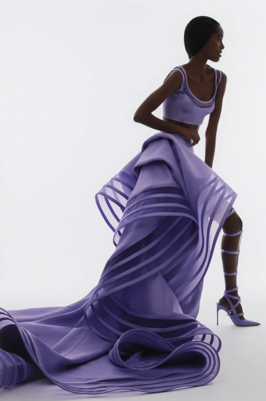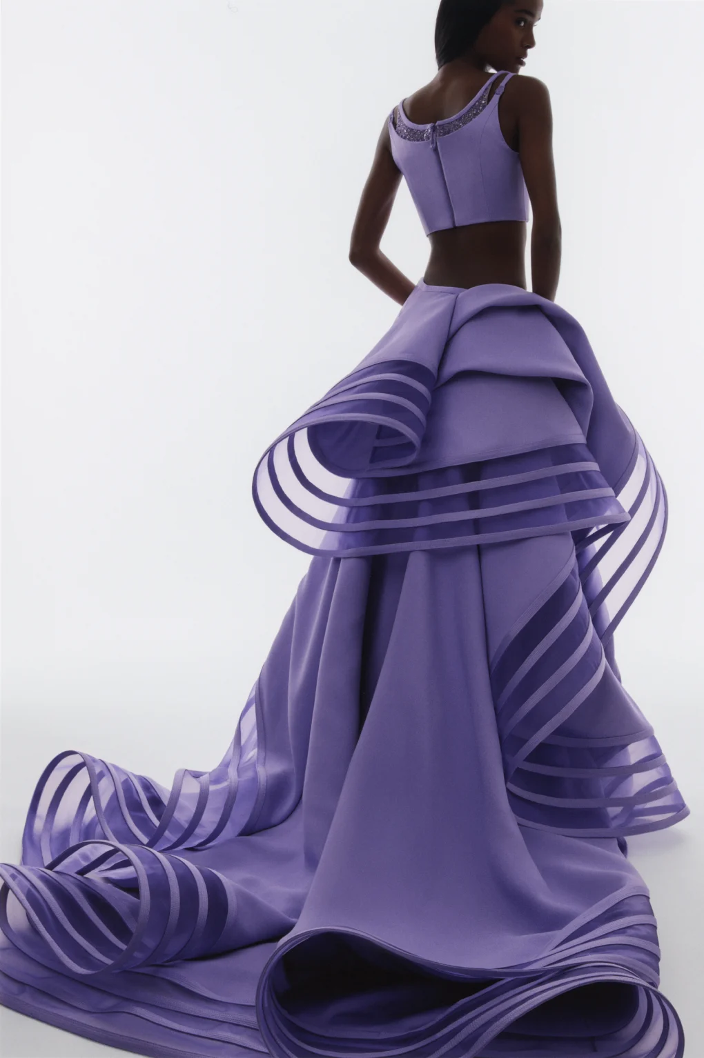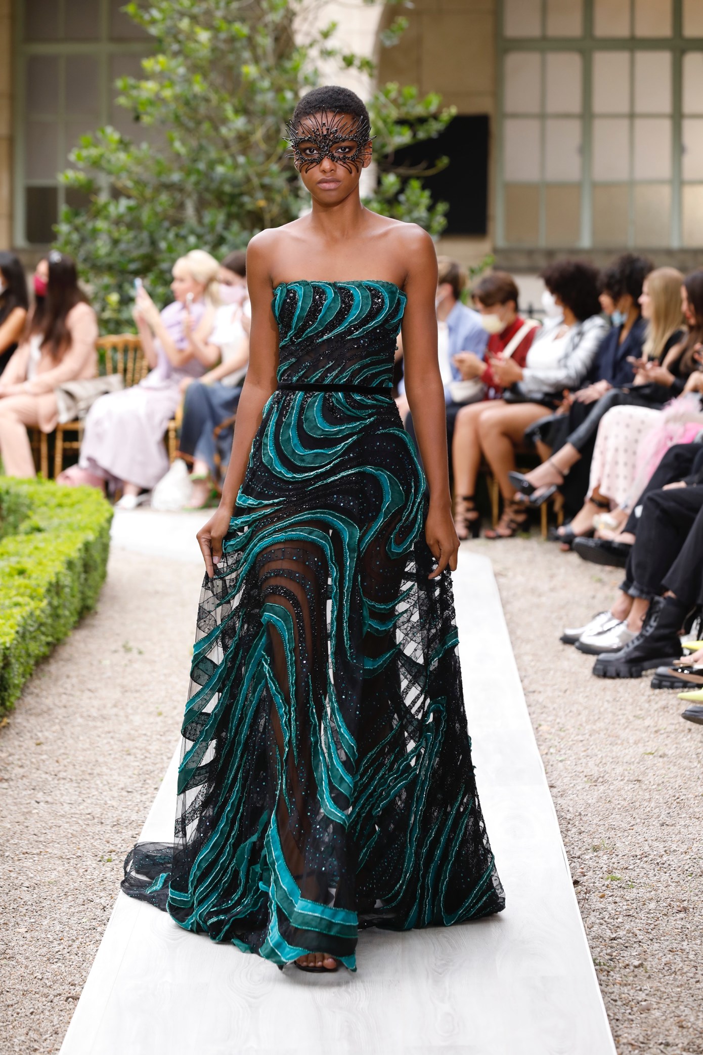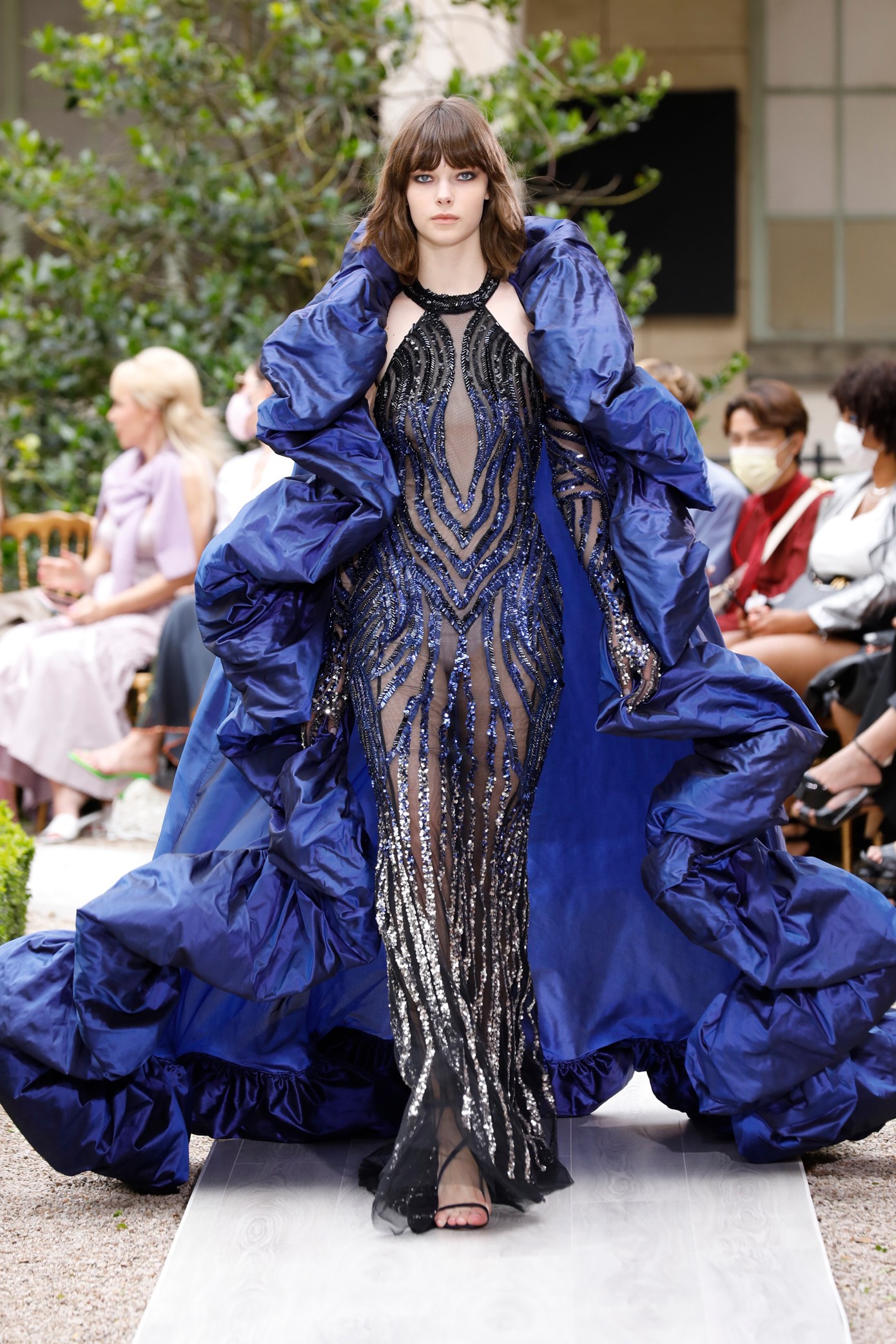 Details: Peplum Ruffles. Squiggly Vertical Layers. Silk Suits. Cutouts. Puff Sleeves, Ball Gowns. Wavy Tulle. Floral Applique. Eye Motifs.