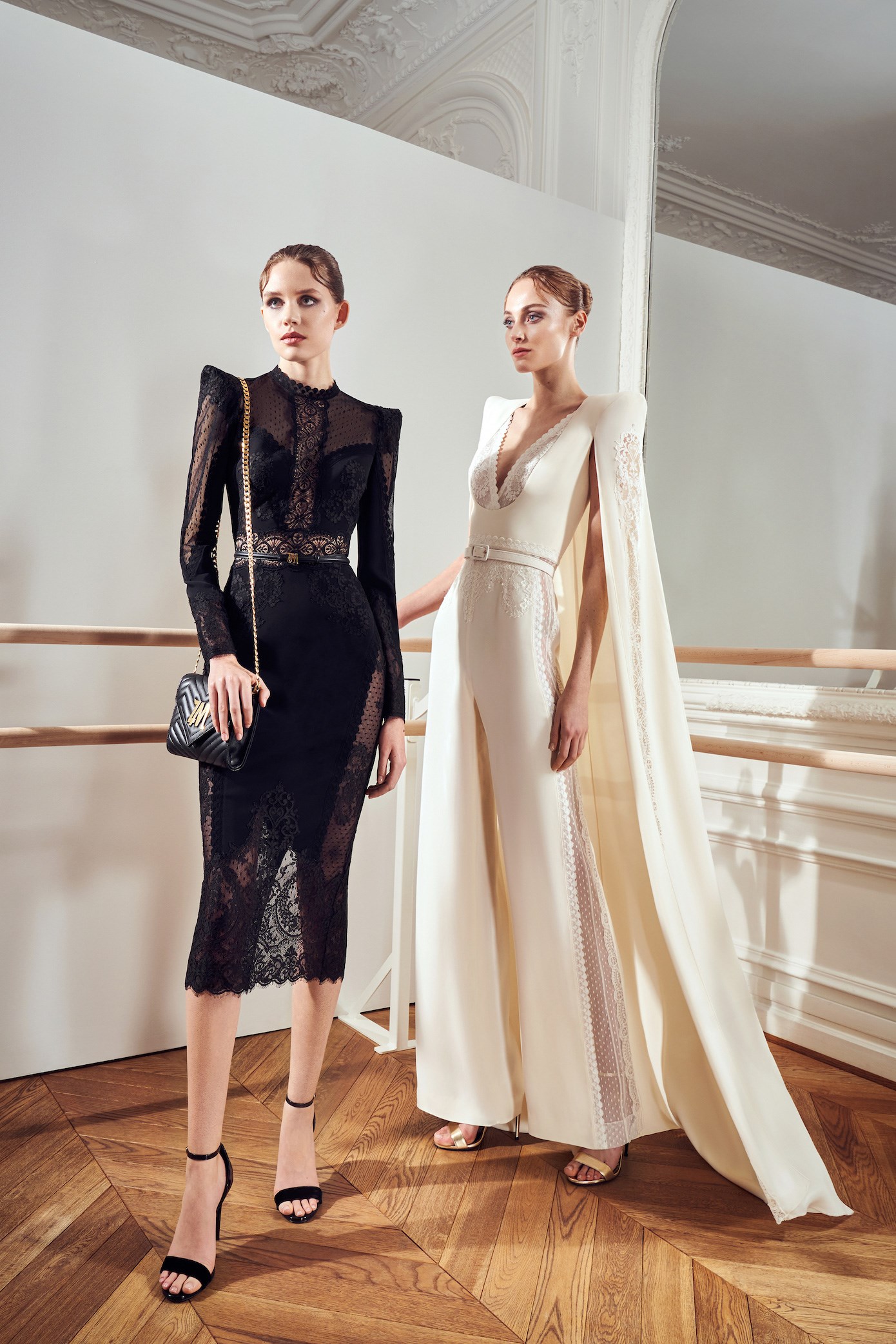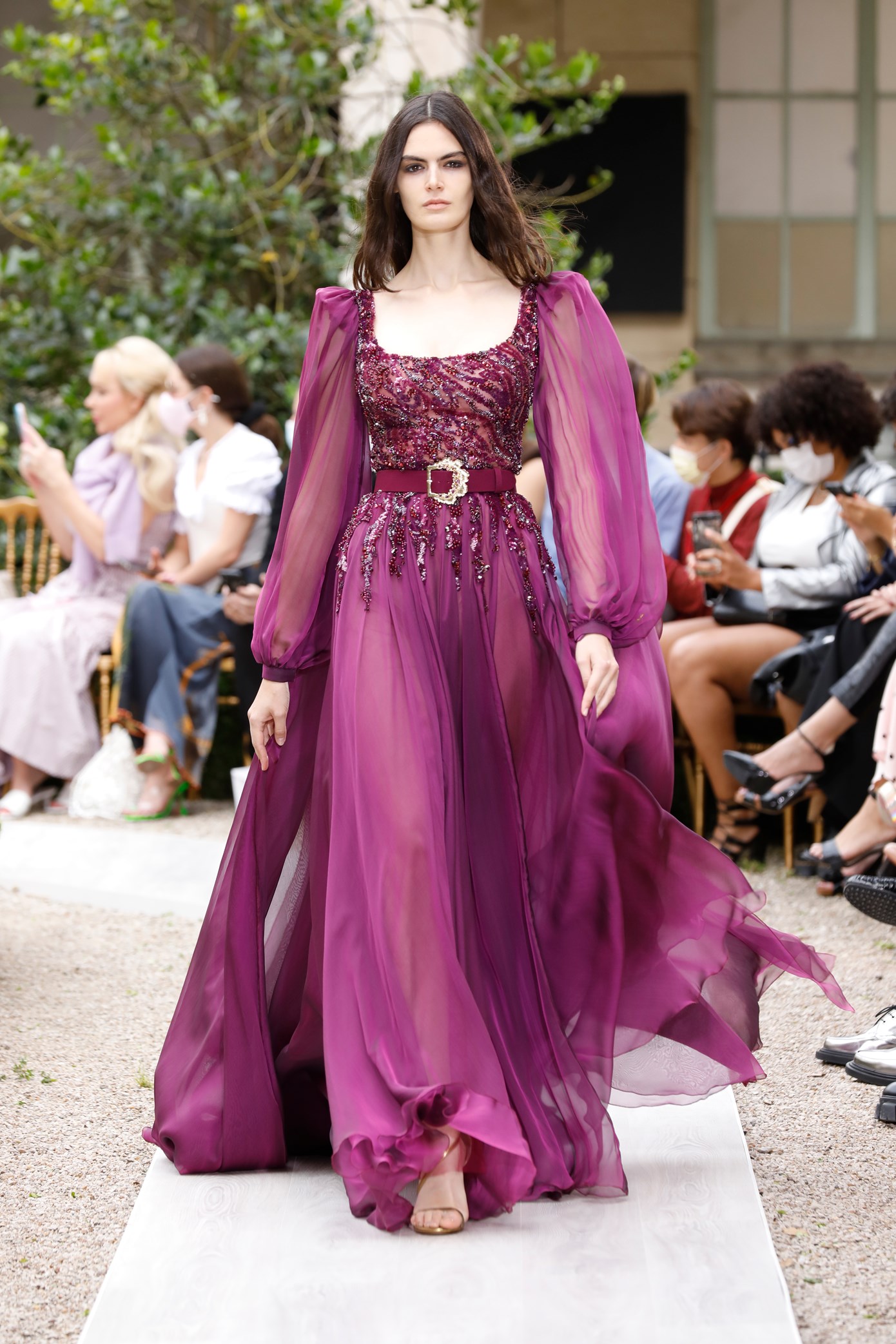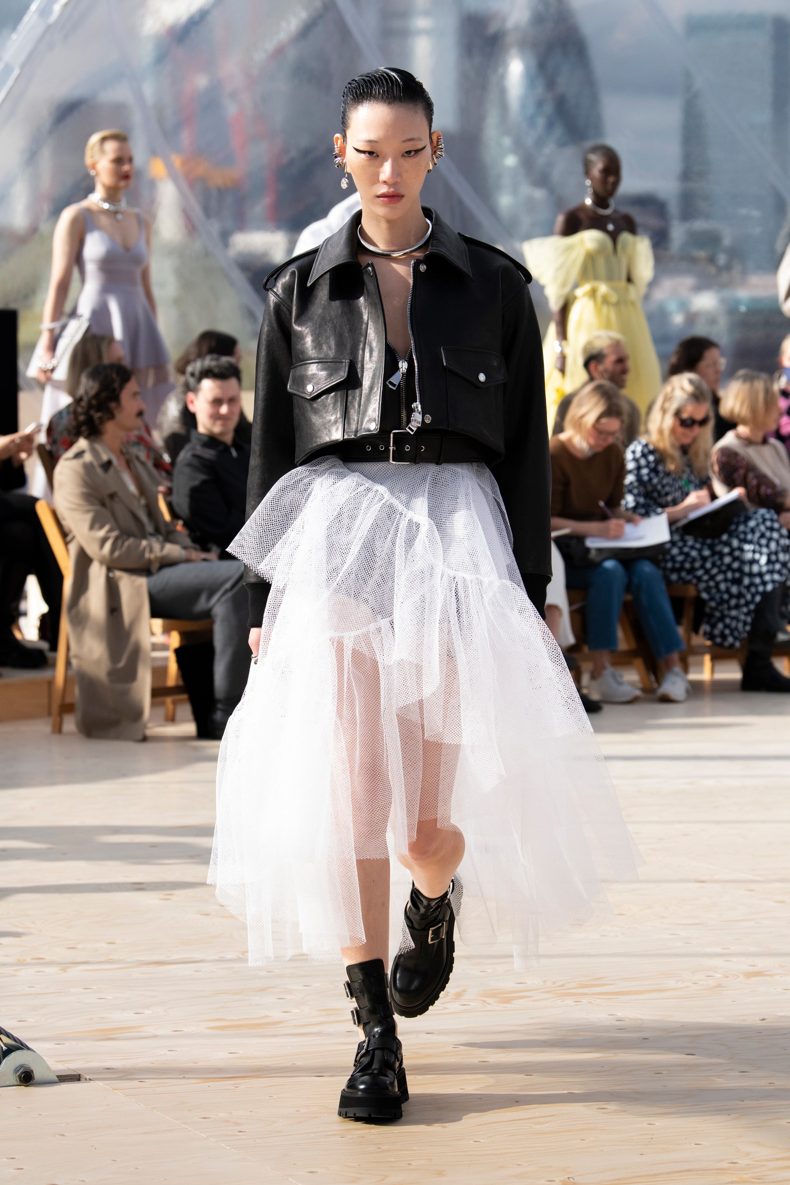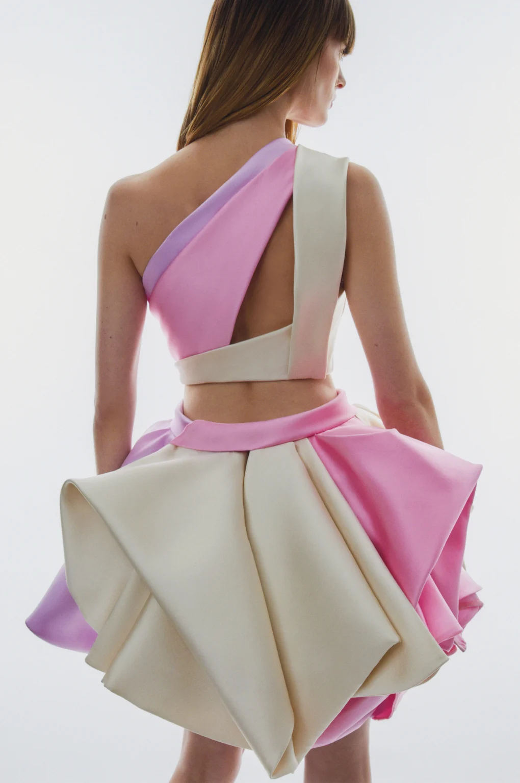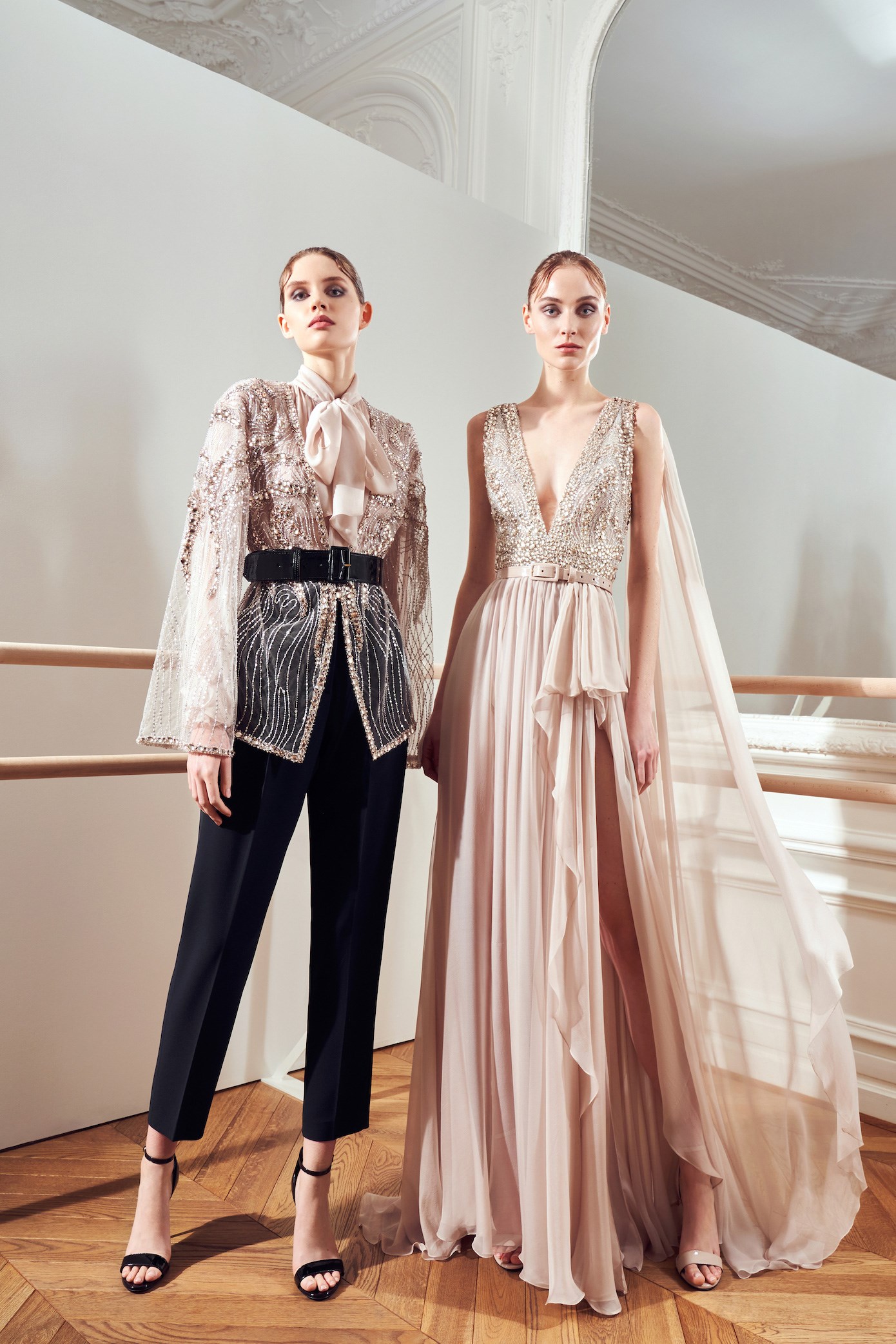 Details: Peplum Ruffles. Squiggly Vertical Layers. Silk Suits. Cutouts. Puff Sleeves, Ball Gowns. Wavy Tulle. Floral Applique. Eye Motifs.