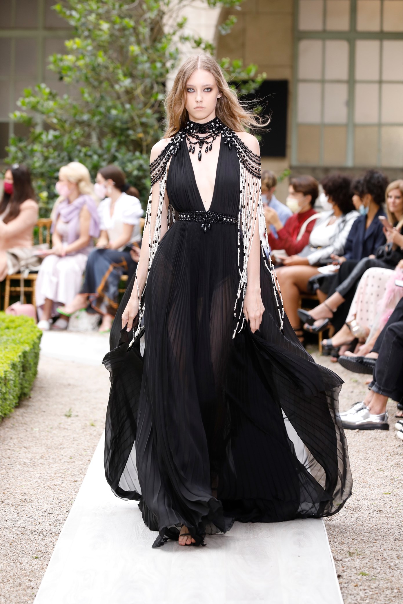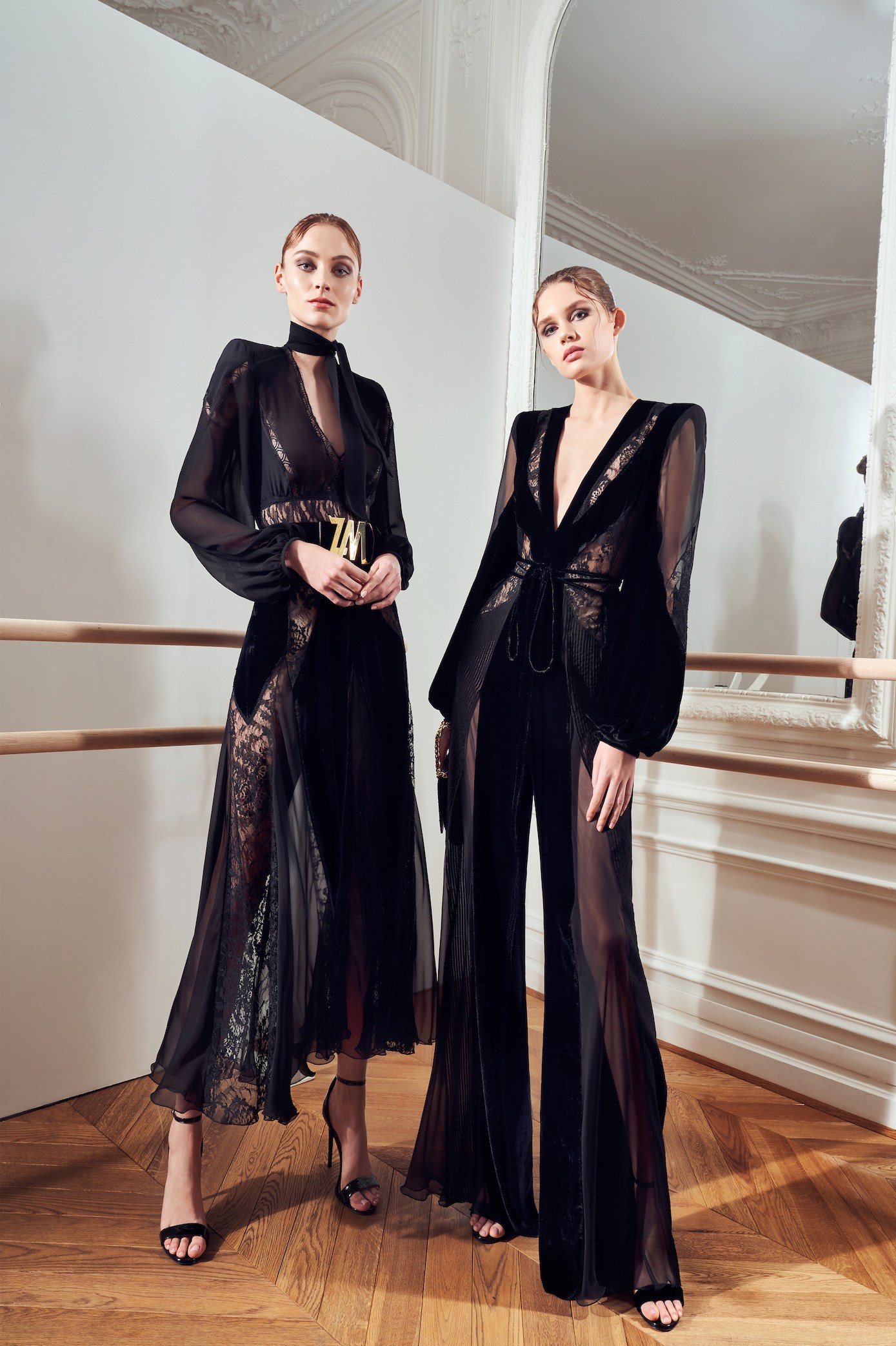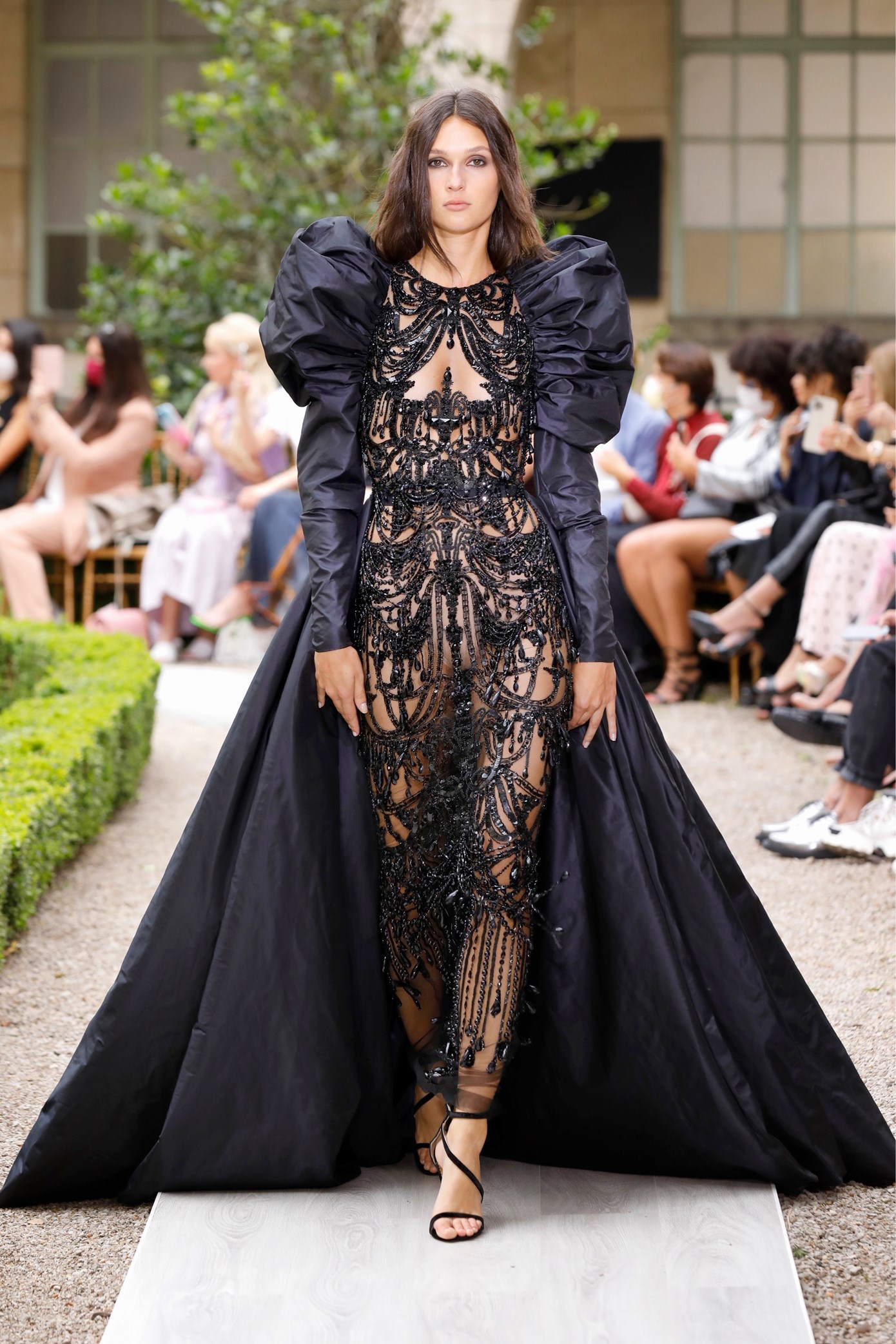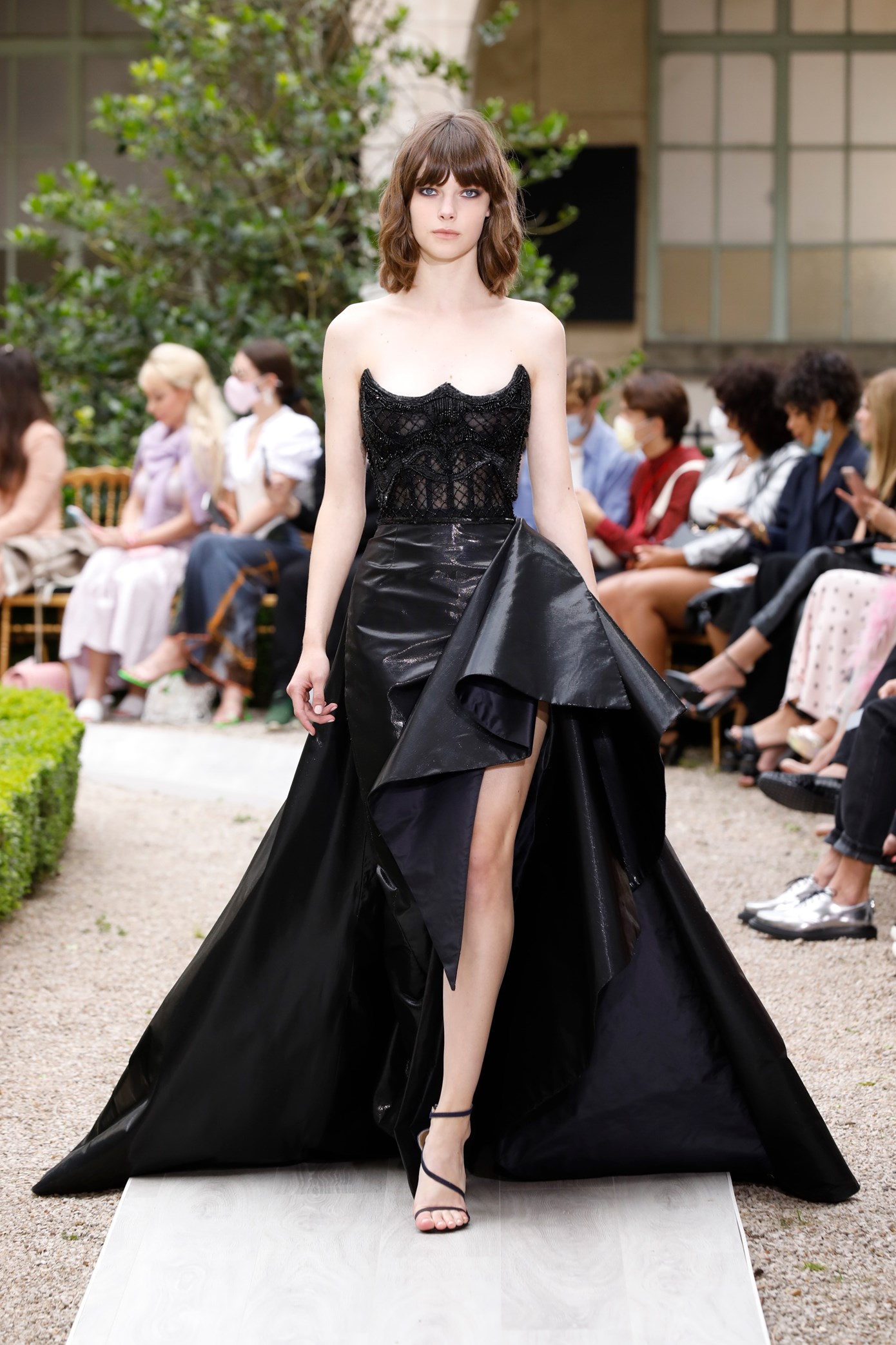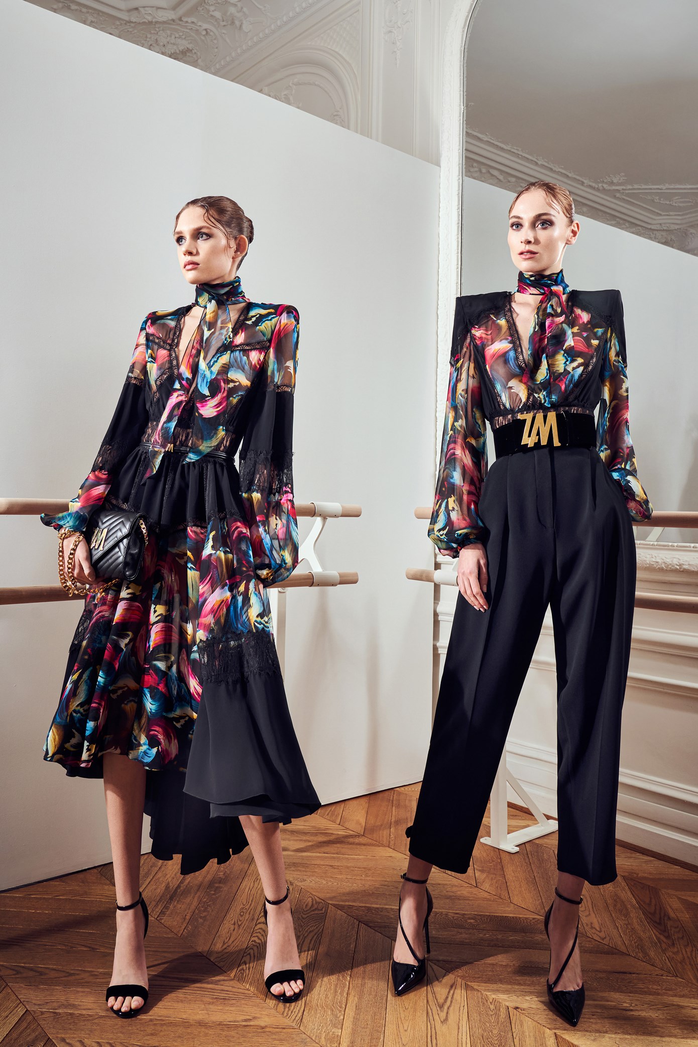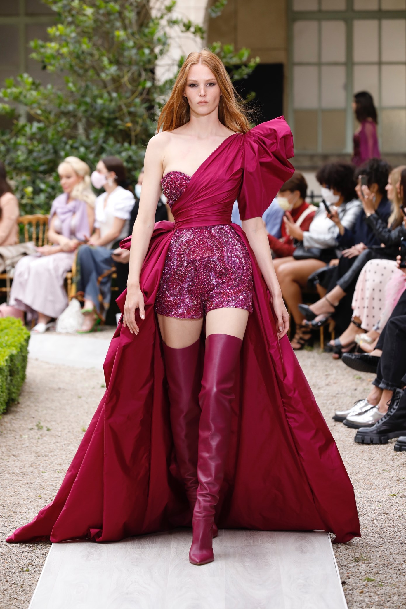 Details: Peplum Ruffles. Squiggly Vertical Layers. Silk Suits. Cutouts. Puff Sleeves, Ball Gowns. Wavy Tulle. Floral Applique. Eye Motifs.