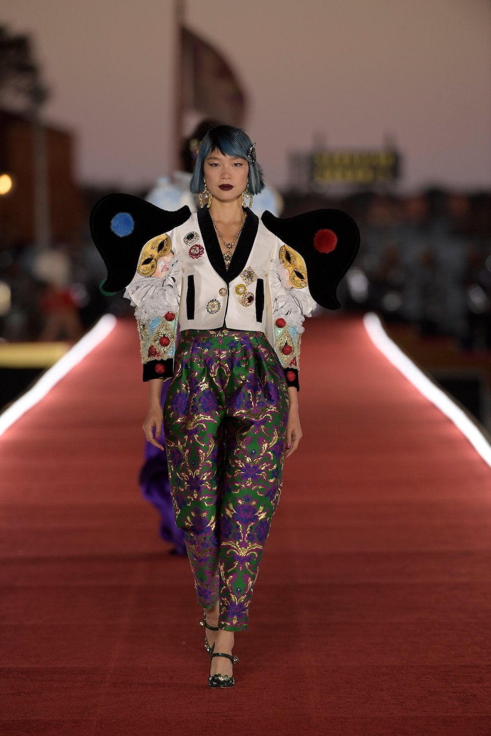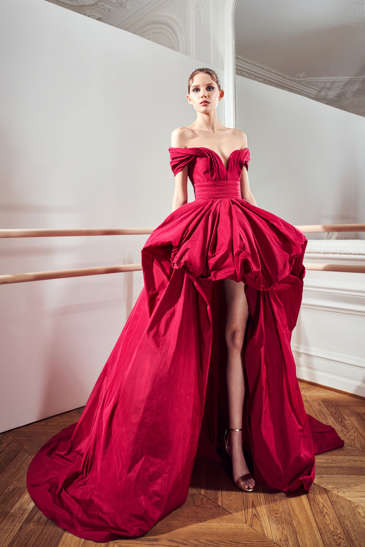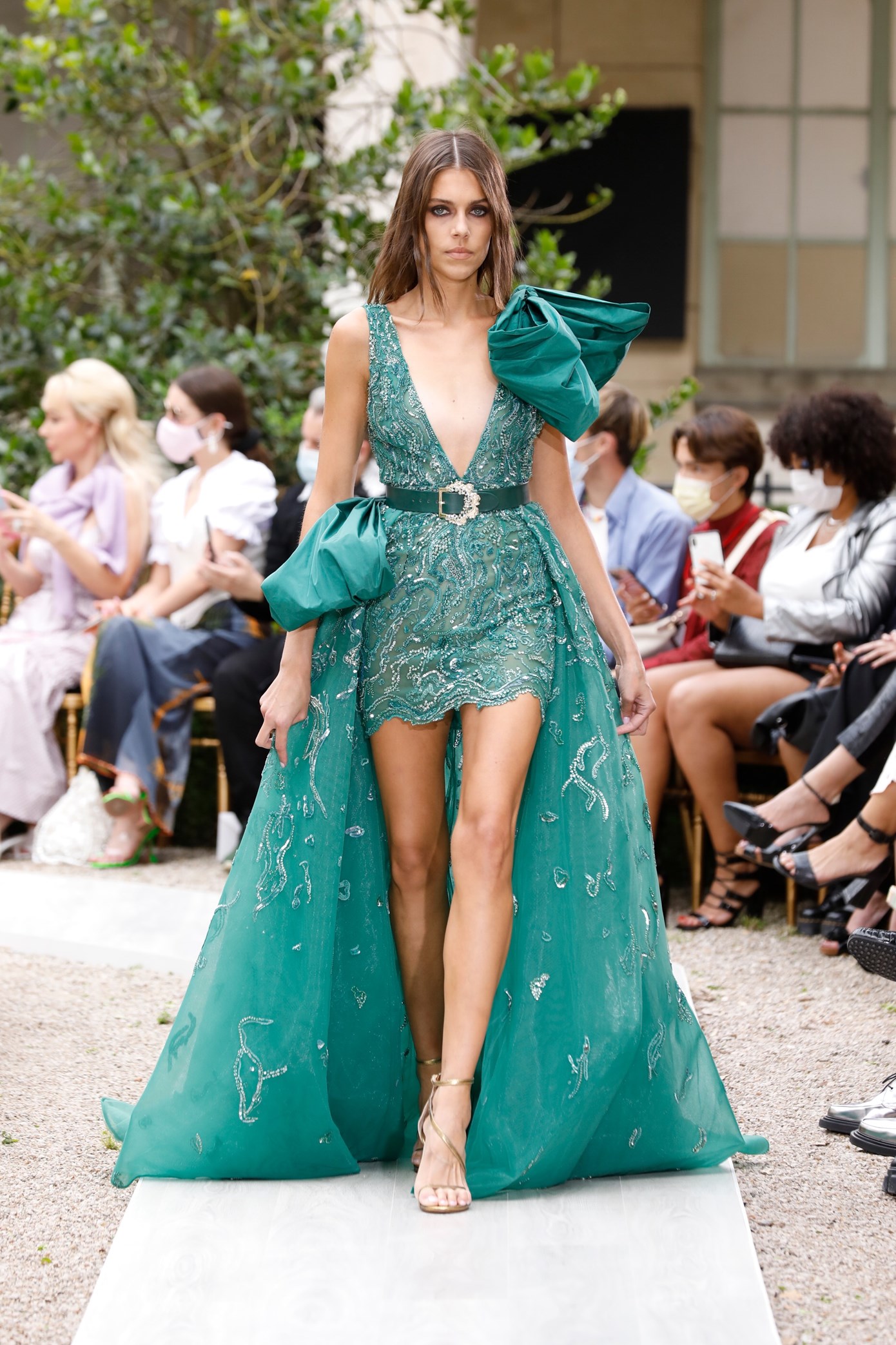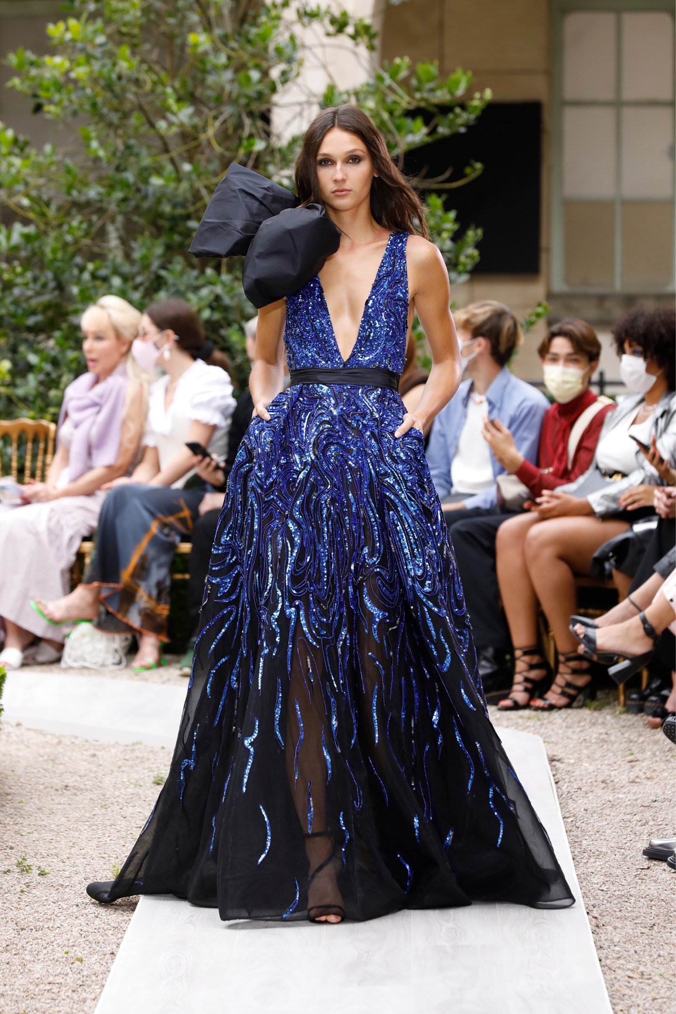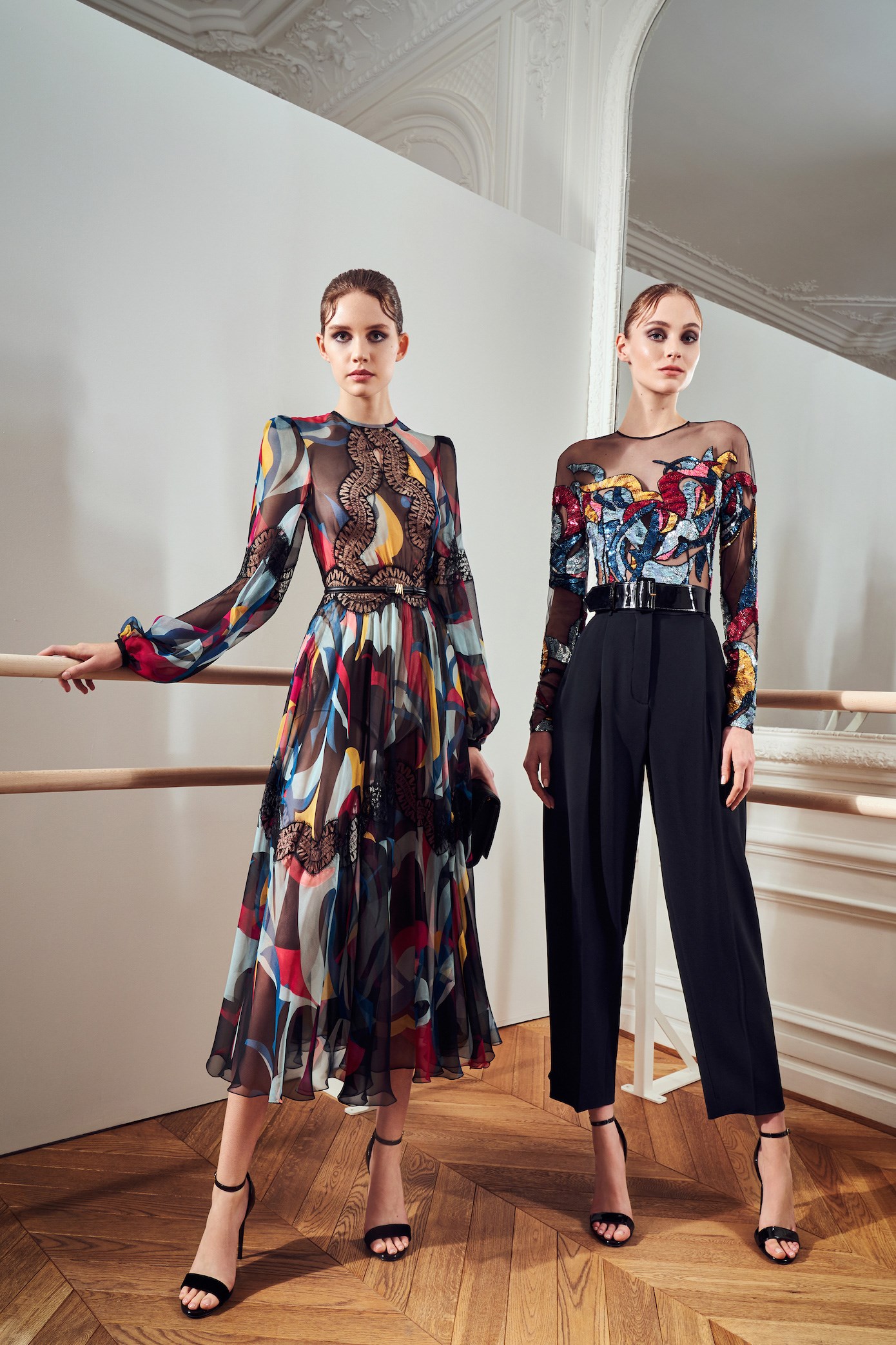 Details: Peplum Ruffles. Squiggly Vertical Layers. Silk Suits. Cutouts. Puff Sleeves, Ball Gowns. Wavy Tulle. Floral Applique. Eye Motifs.