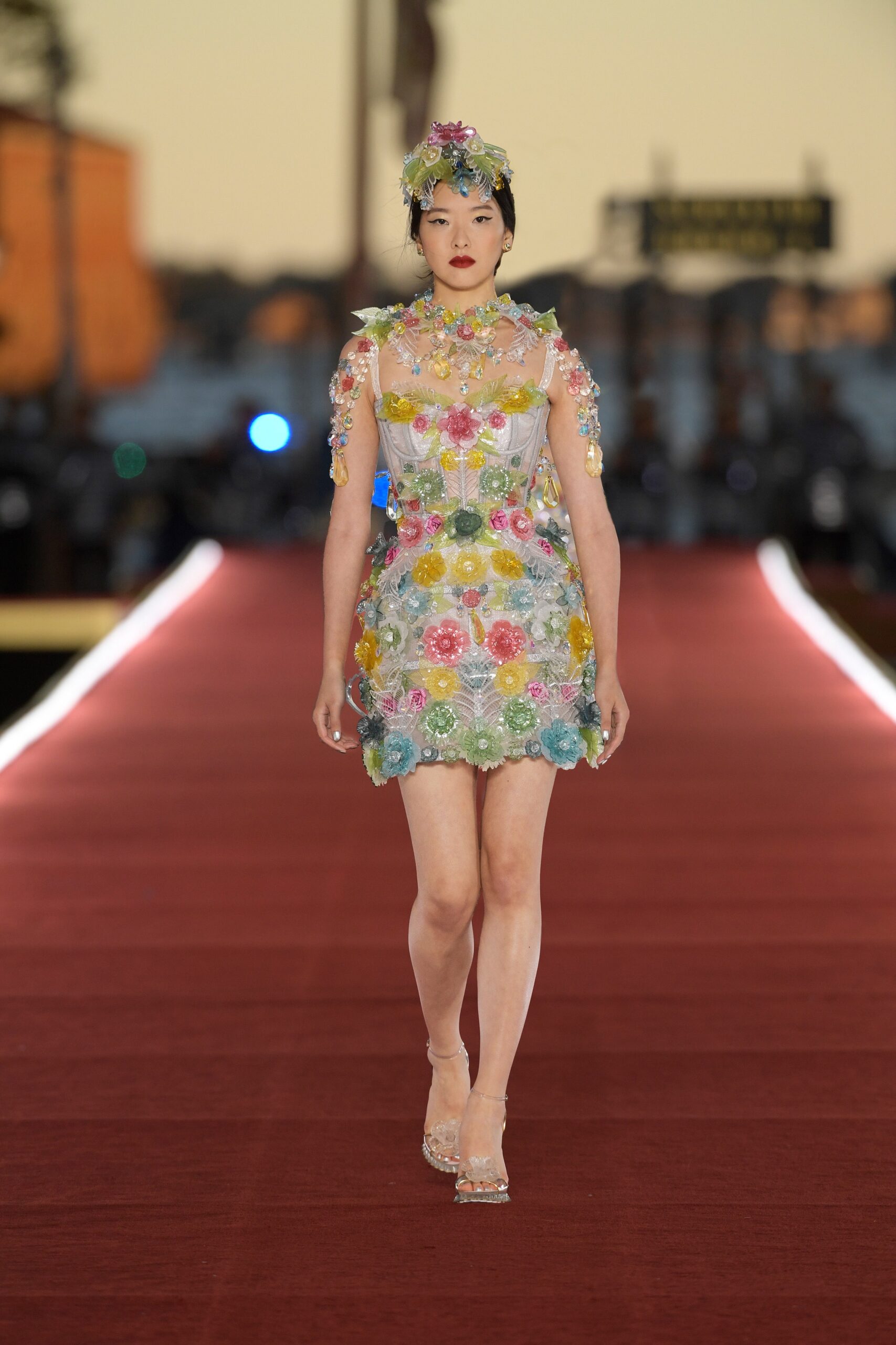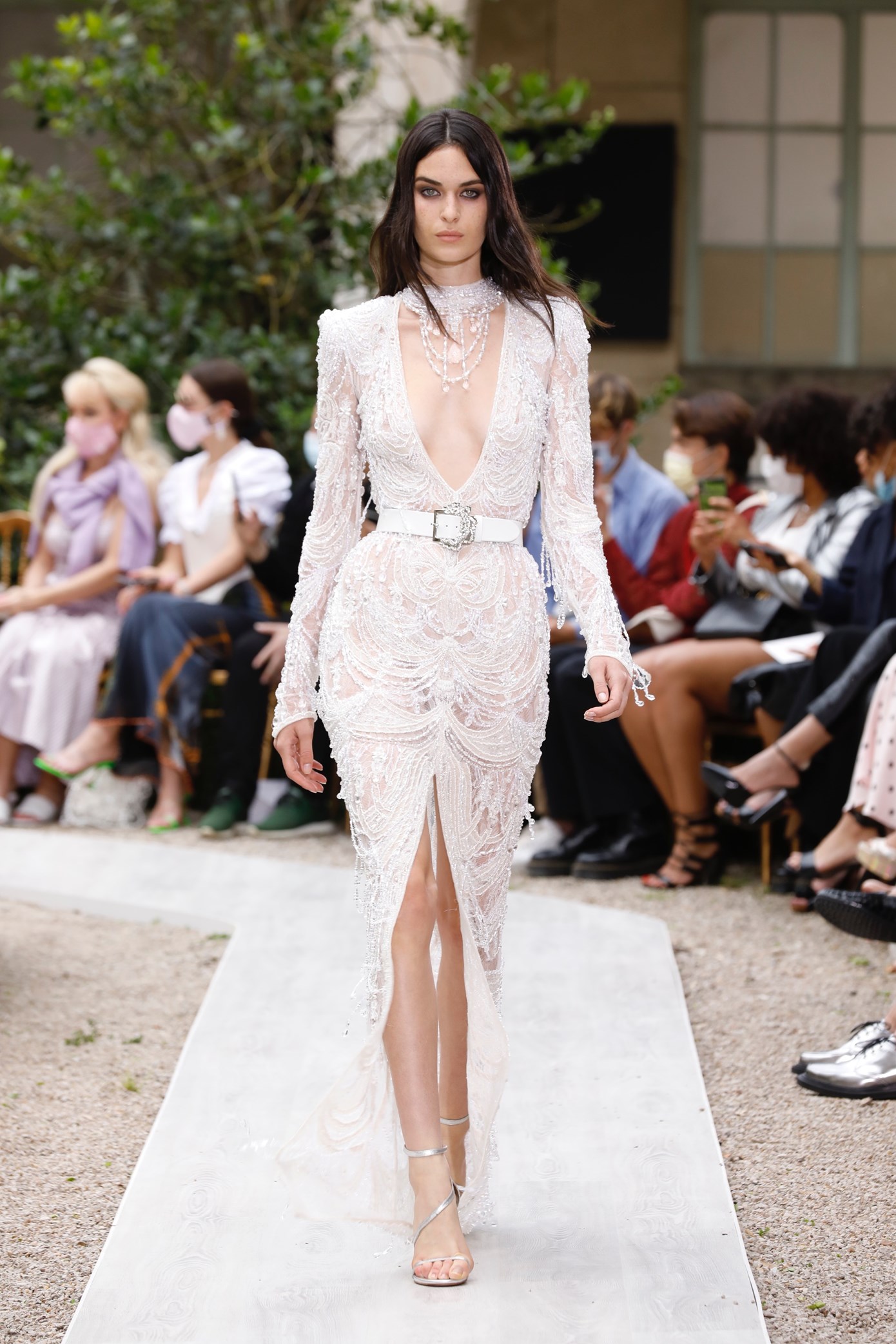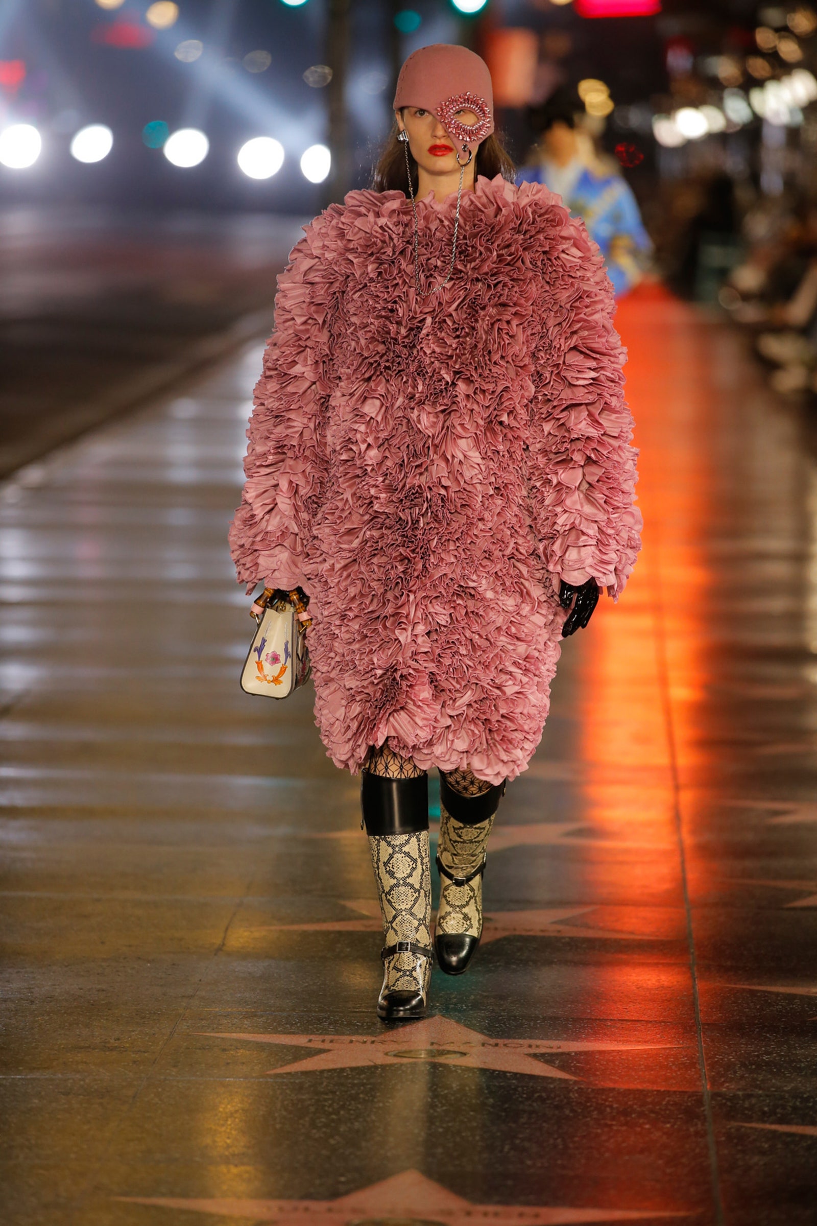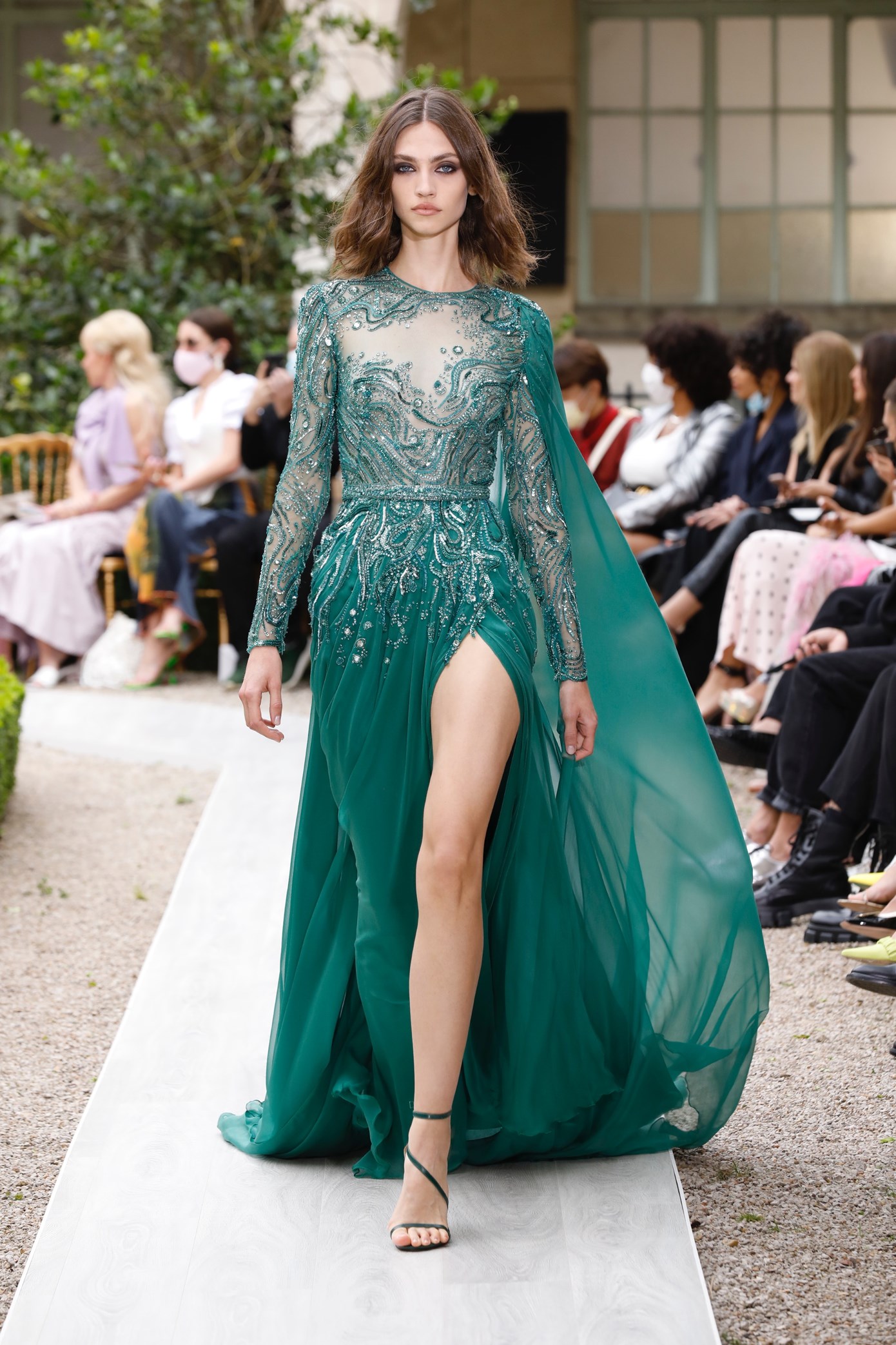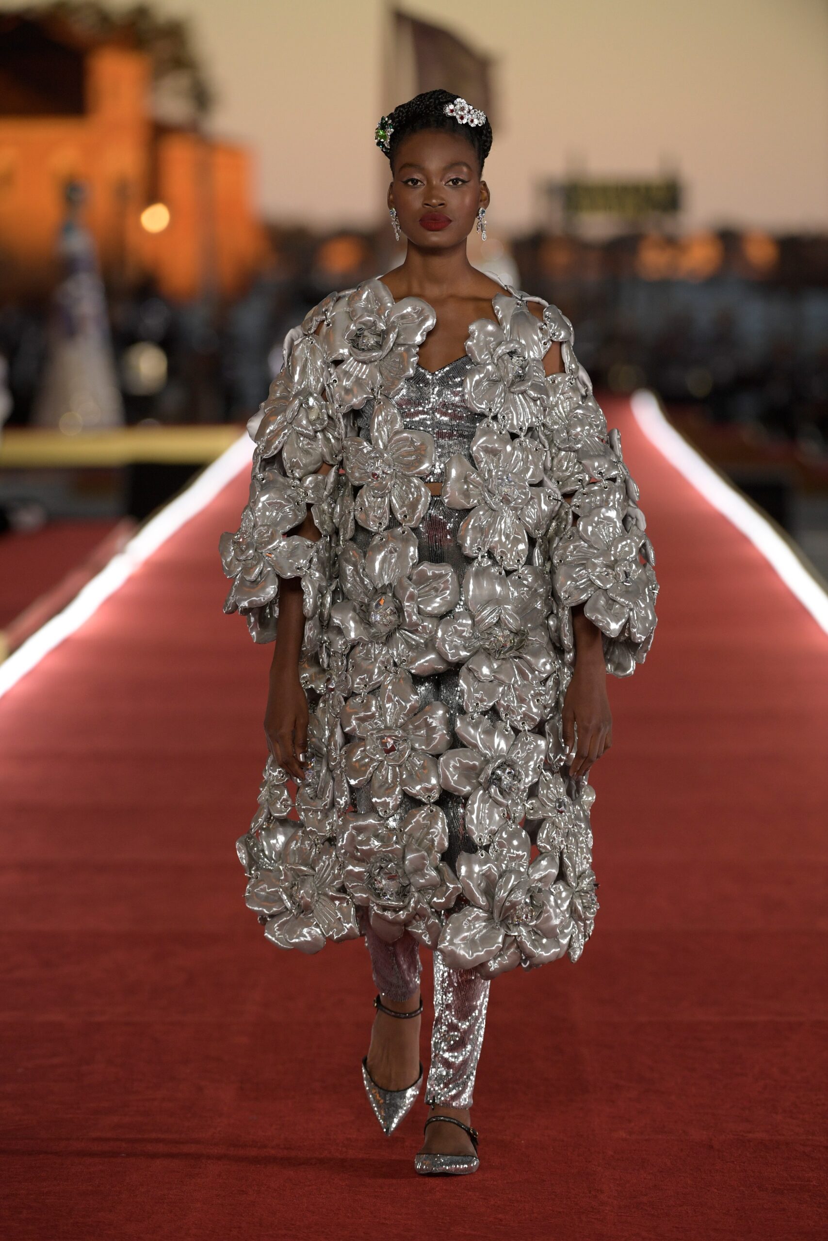Details: Peplum Ruffles. Squiggly Vertical Layers. Silk Suits. Cutouts. Puff Sleeves, Ball Gowns. Wavy Tulle. Floral Applique. Eye Motifs.