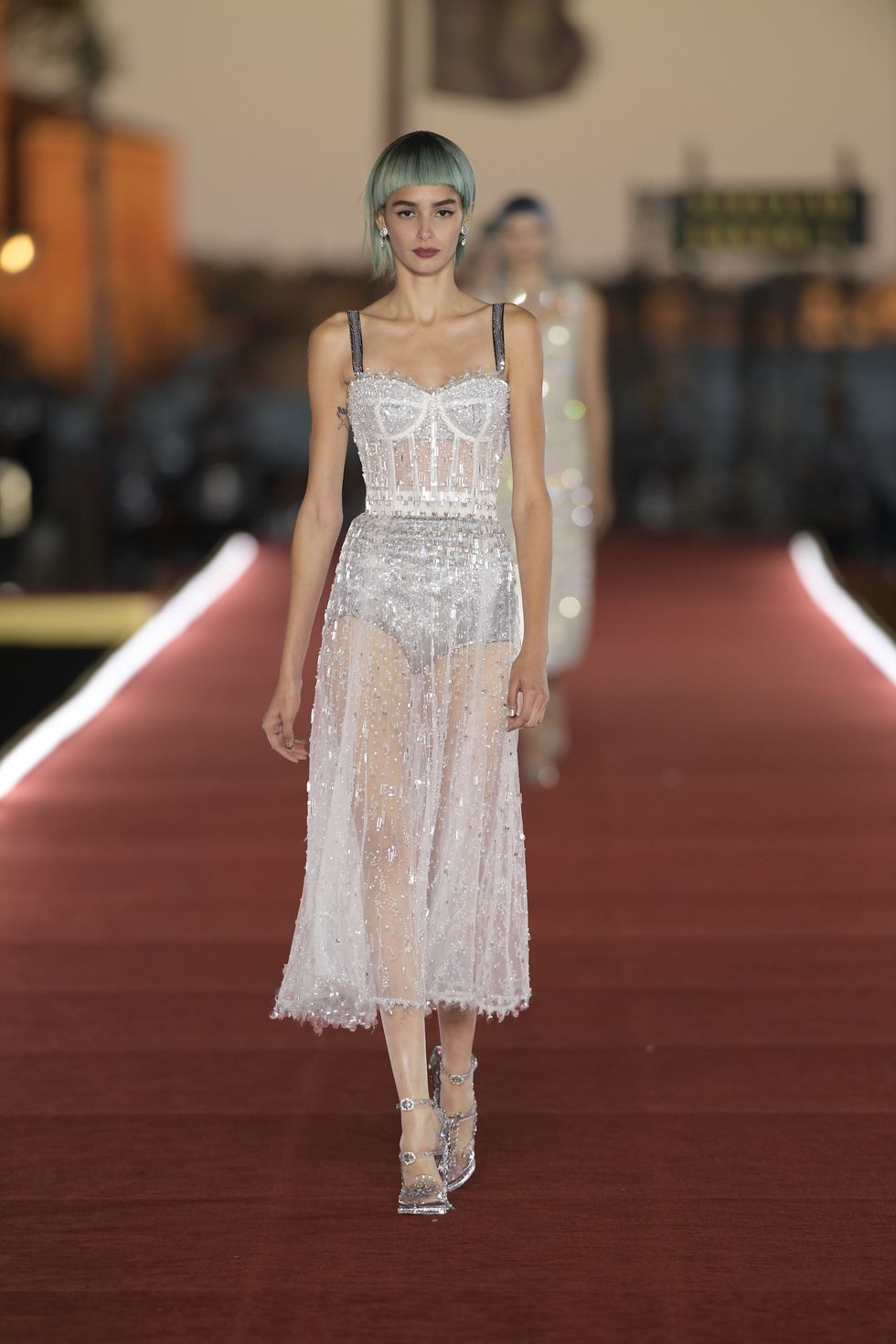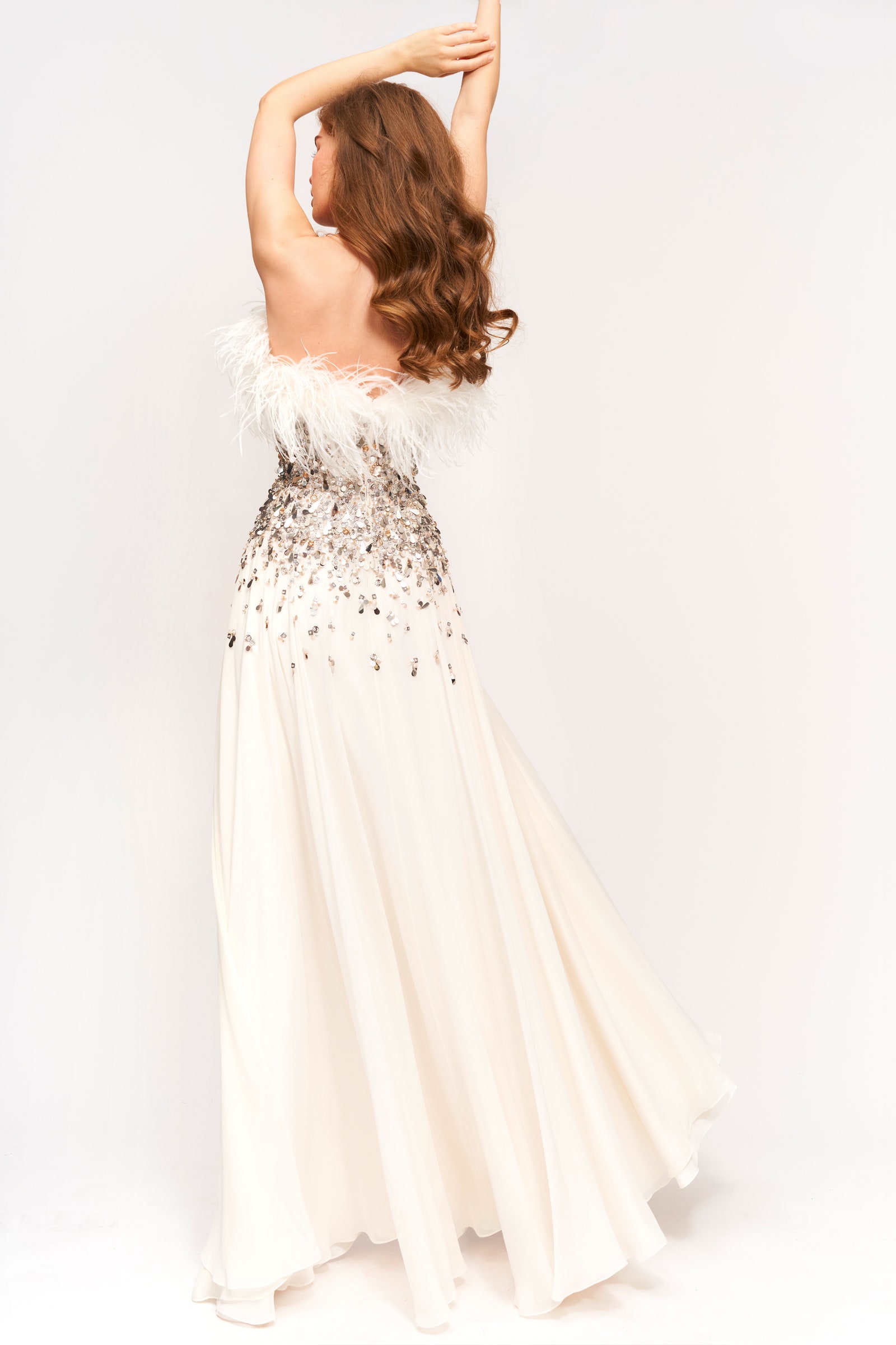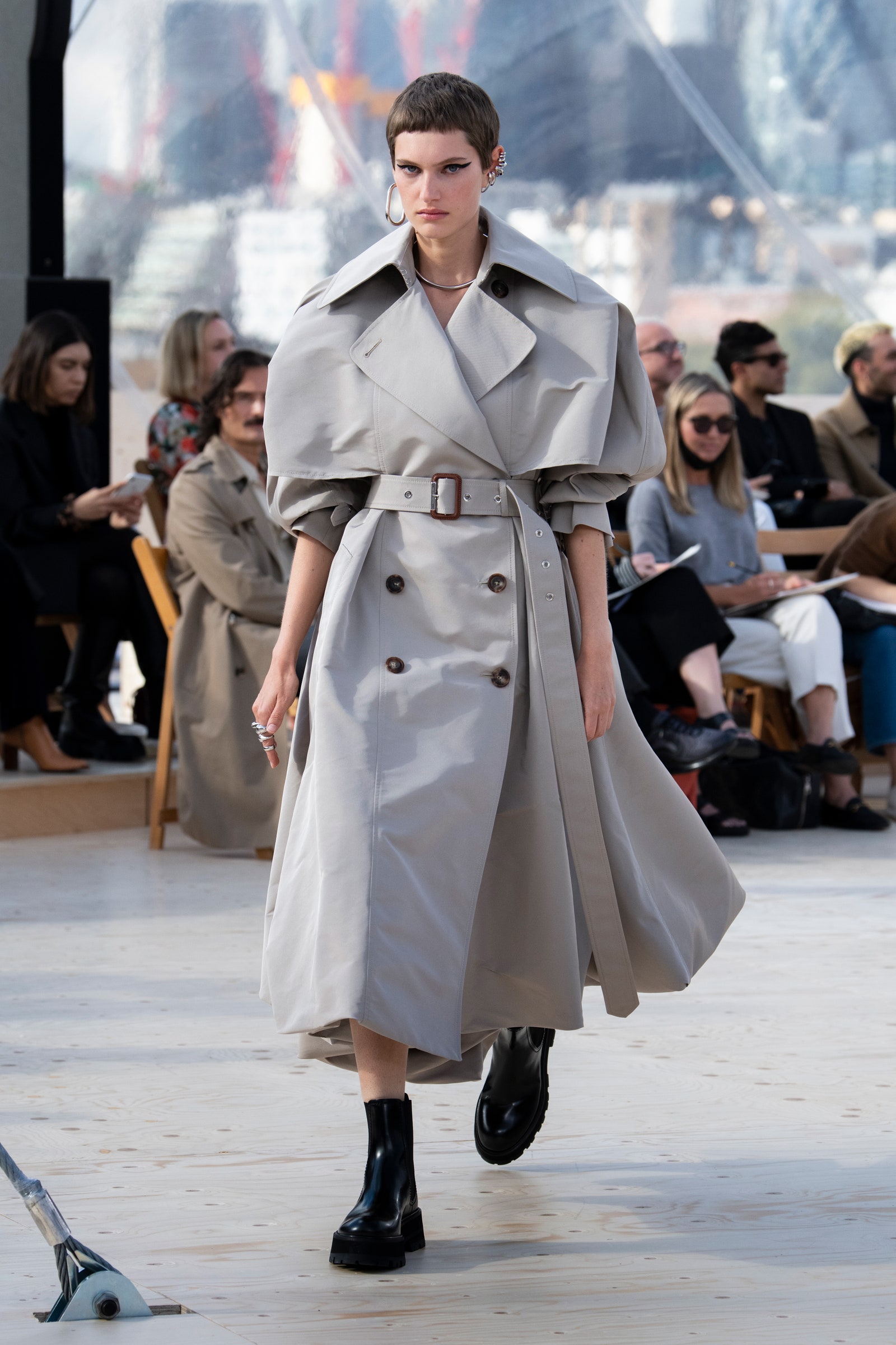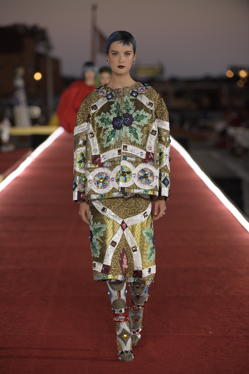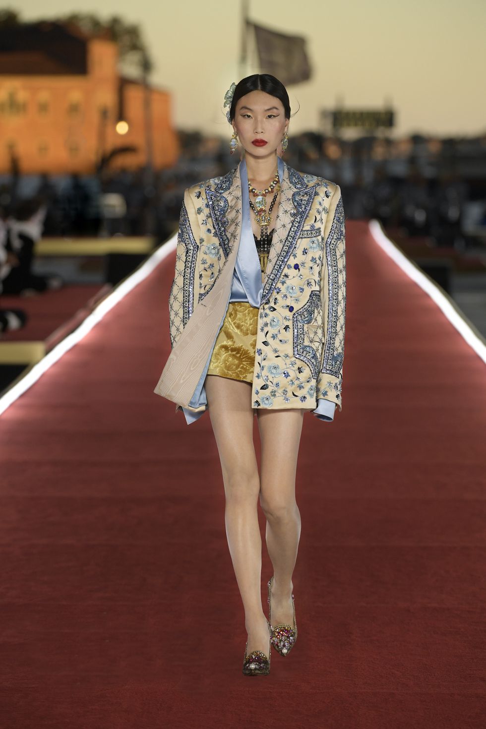 Details: Peplum Ruffles. Squiggly Vertical Layers. Silk Suits. Cutouts. Puff Sleeves, Ball Gowns. Wavy Tulle. Floral Applique. Eye Motifs.